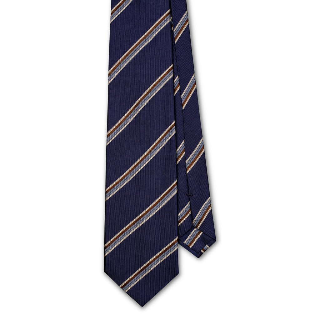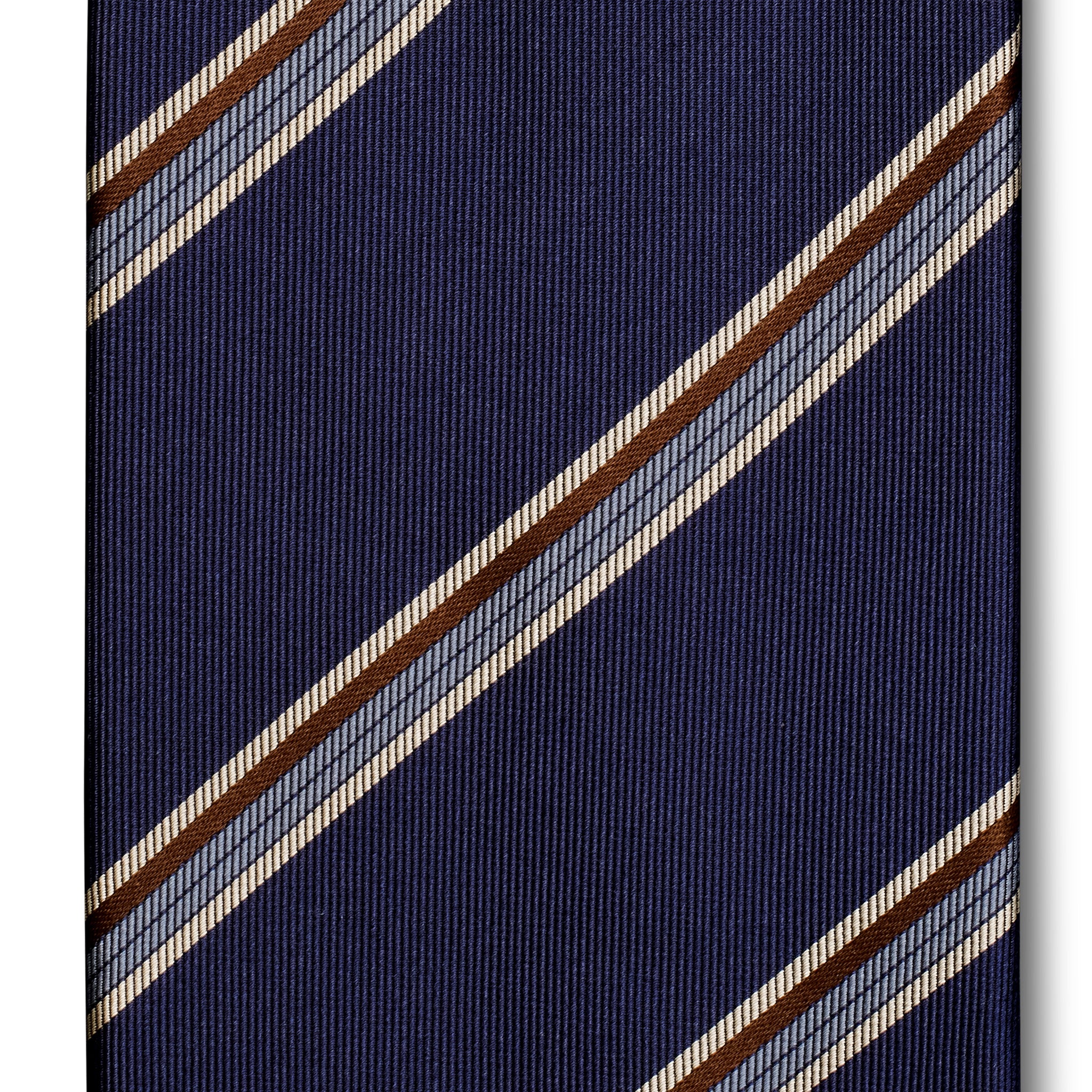 In a deep navy with blue, cream and brown Reppe stripes, this tie is sure to bring a classic and classy finish to your formal outfits.