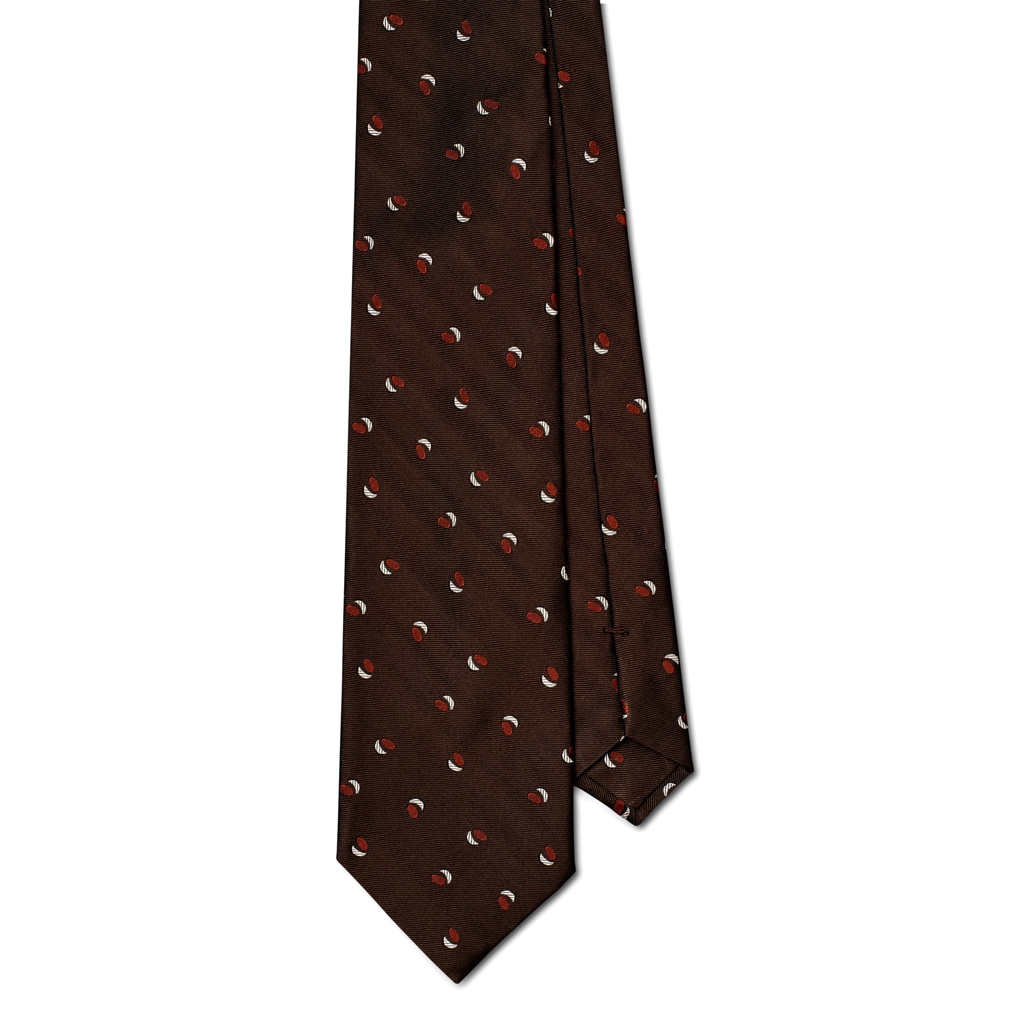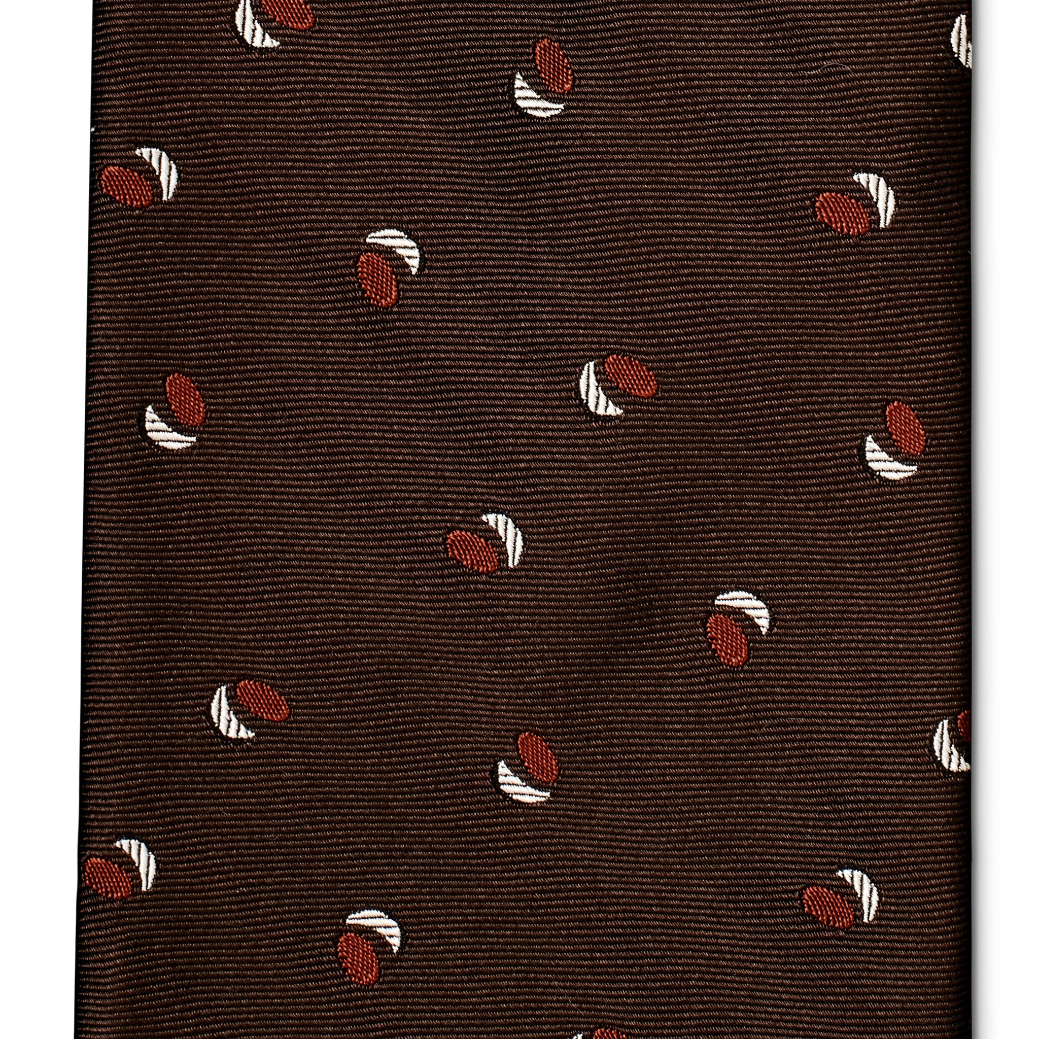 In a dark chocolate colour with crescents and ellipses closely nestled together, this brown tie has the effect of polka dots, softened and deconstructed with astronomic shapes.