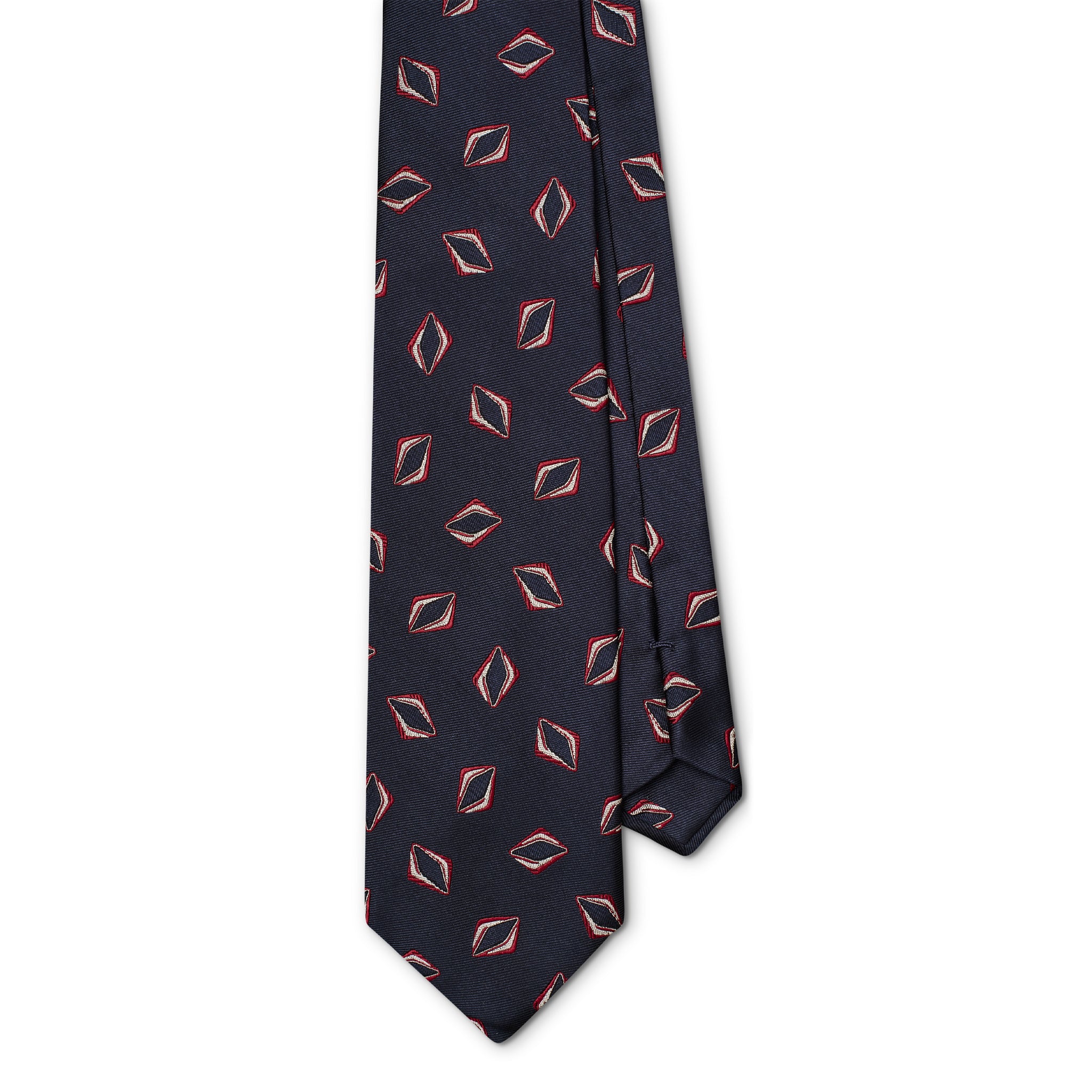 Woven to feature a geometric configuration resembling lozenges, this timeless navy and wine tie is a great way of introducing some colour and pattern to your outfits - be it for work or for play.