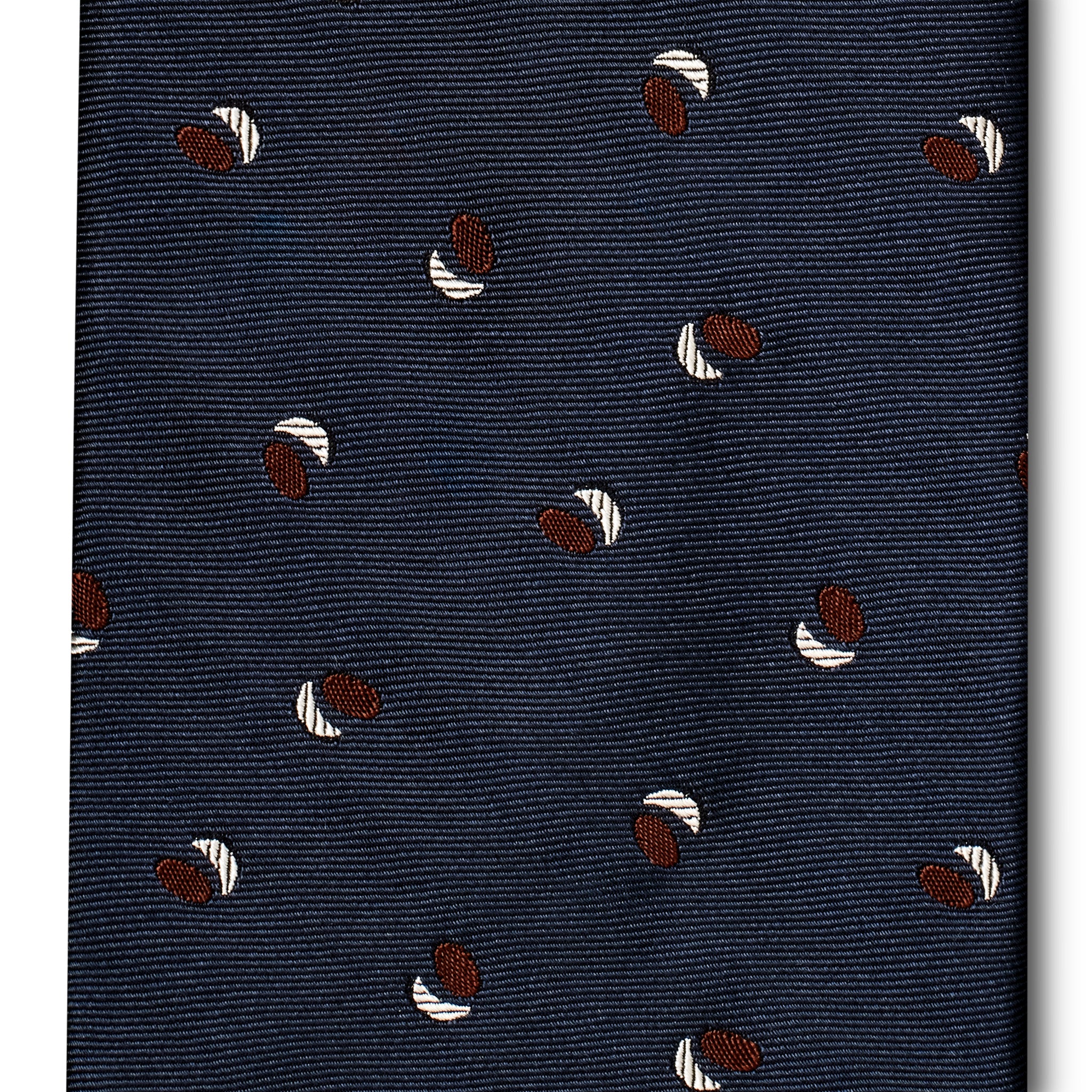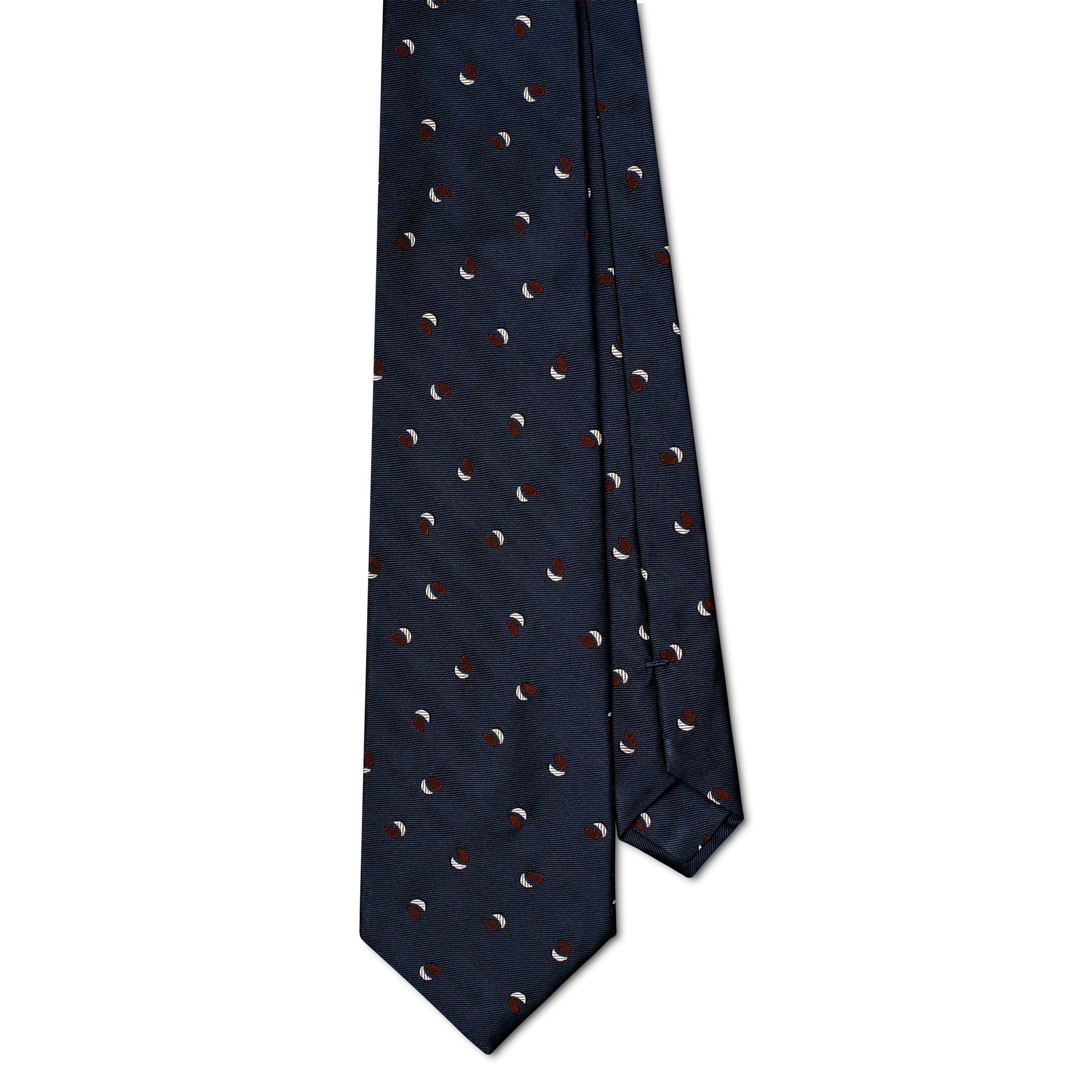 In a dark blue with crescents and ellipses closely nestled together, this navy tie has the effect of polka dots, softened and deconstructed with astronomic shapes.