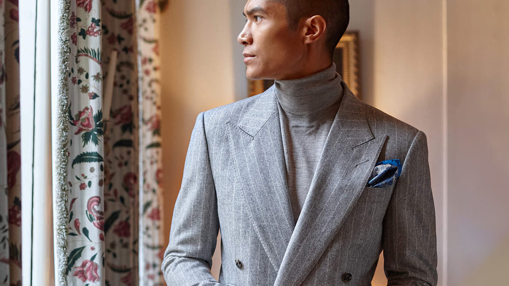 Knitwear is a sophisticated alternative to classic shirting, perfect for smart-casual dress or weekendwear. The weight and style of the knit should be determined by the season. In the cooler months, we like to pair fine gauge merino or cashmere rollnecks with flannel suits in rich, earthy colours. Try a black cashmere rollneck beneath a grey flannel double-breasted suit cut in our house style, finished with polished black Chelsea boots. Chunkier weight crewnecks or rollnecks look handsome beneath greatcoats or heavy tweed sports jackets in the depths of winter.