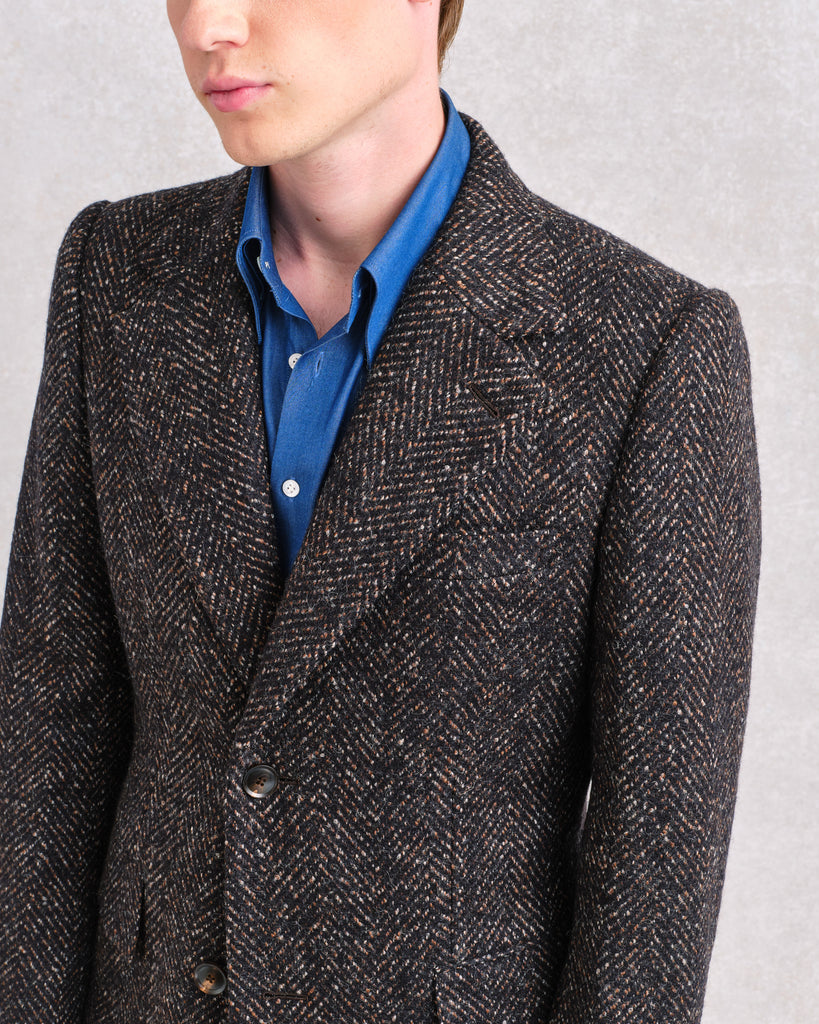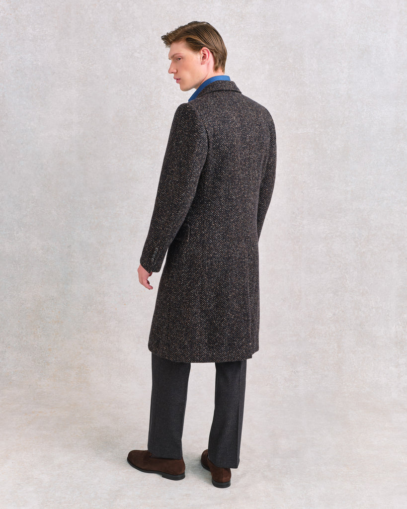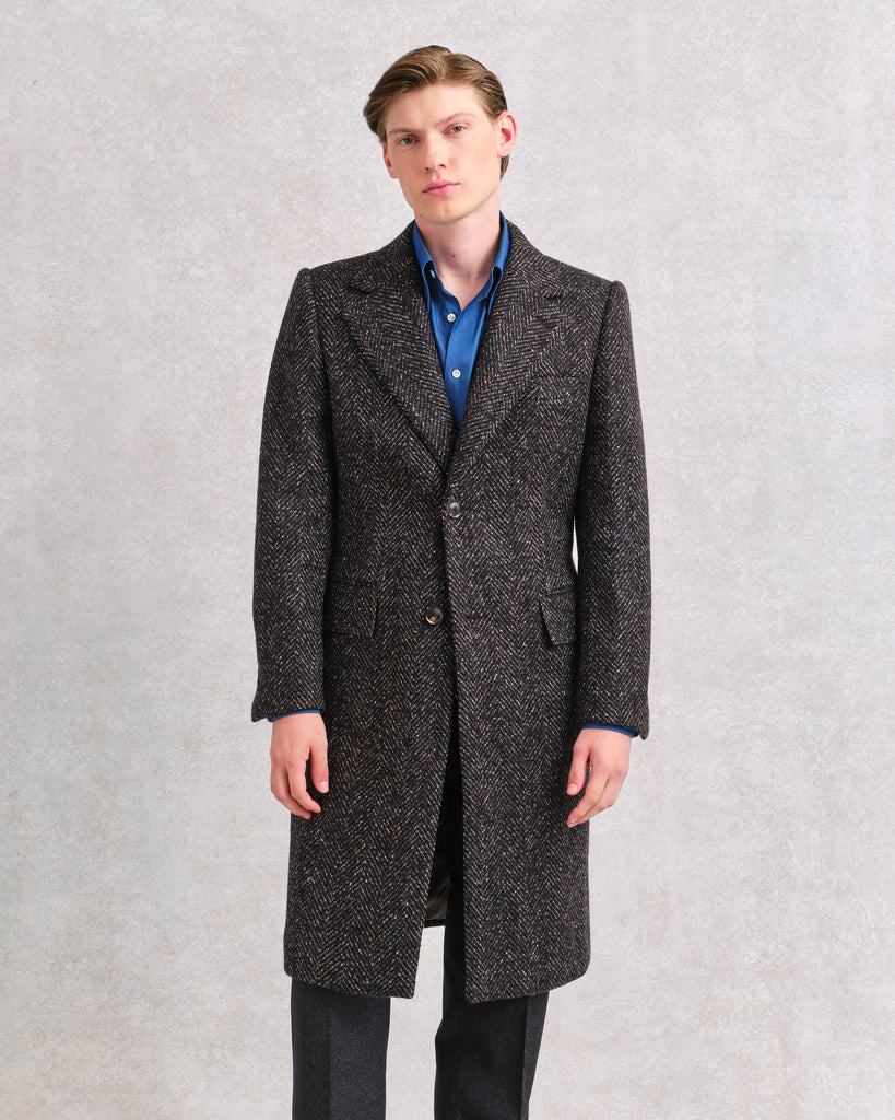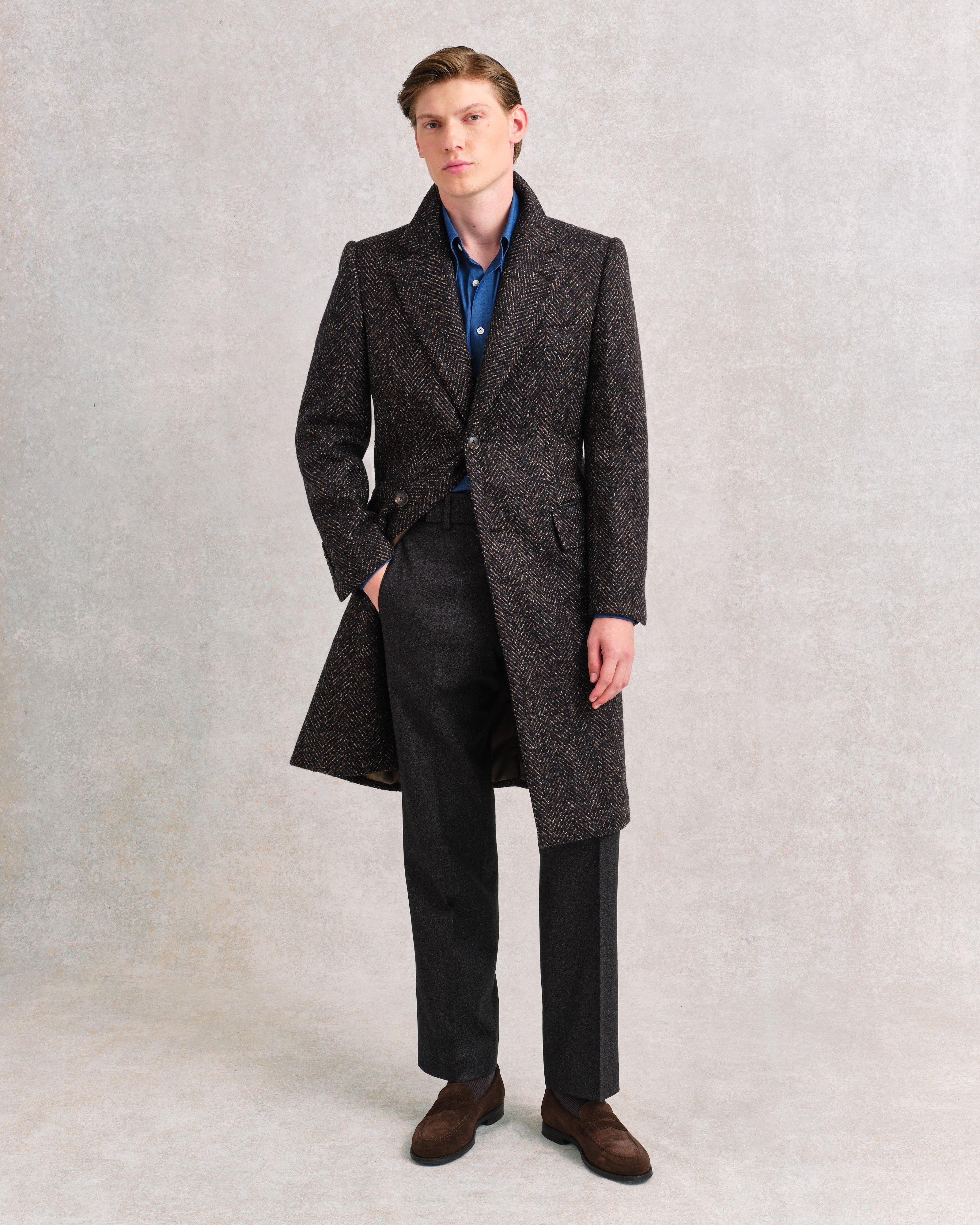 A bold yet understated overcoat in a richly textured black and brown herringbone. The broad, chunky weave blends mottled grey, brown, and black tones, capturing the warmth and depth of autumn. Cut on Sexton’s classic single-breasted block, it balances a clean, tailored shape with an open, elegant lapel line. Substantial in weight and refined in tone, it’s a coat of texture, presence, and timeless Savile Row simplicity.