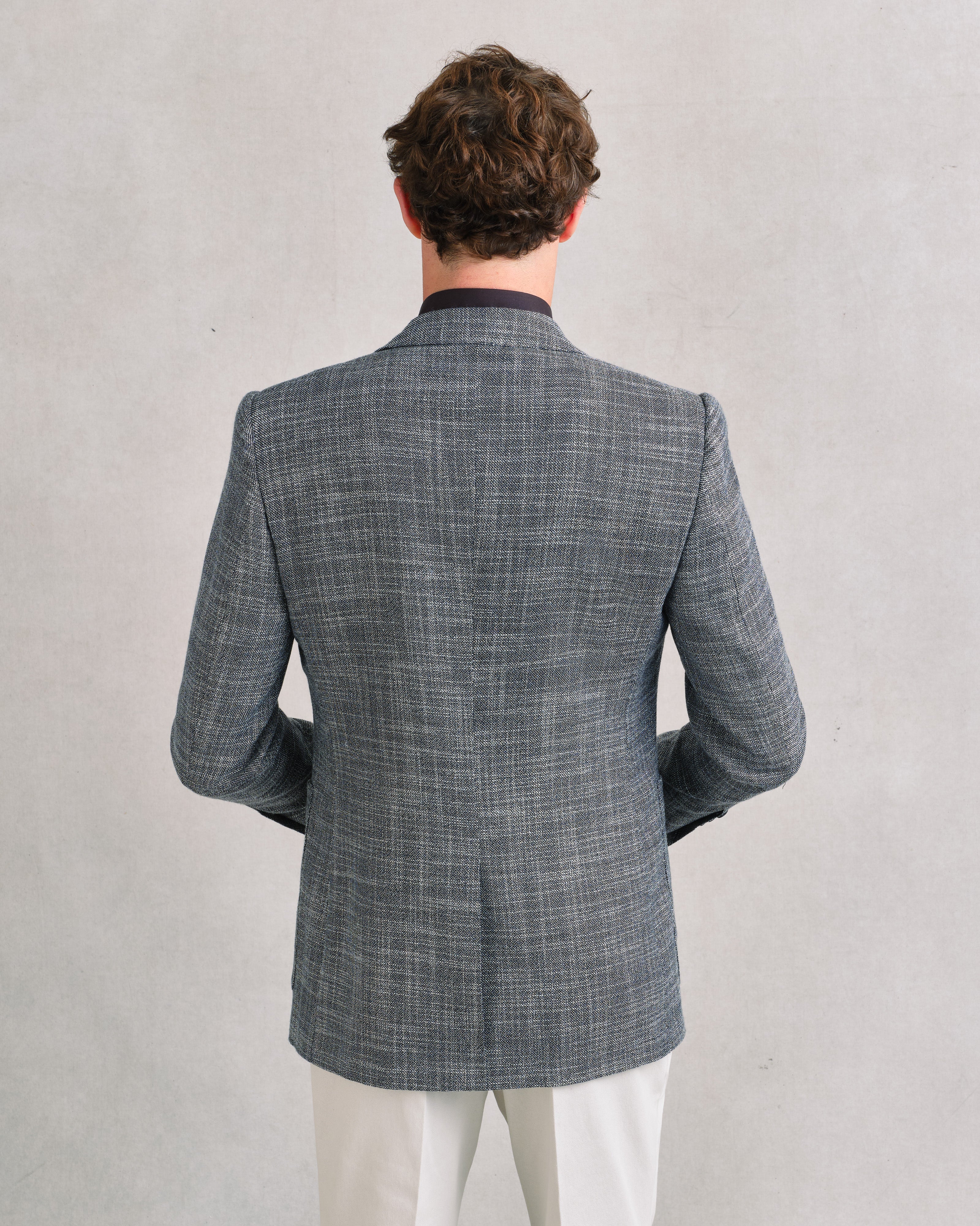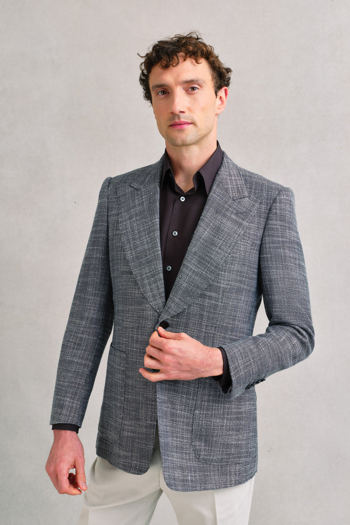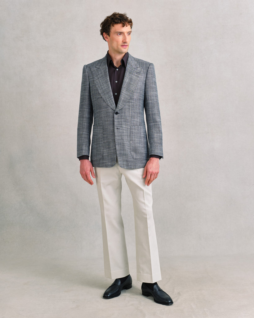 Soft, strong, and effortlessly elegant. Woven from a luxurious blend of 57% cashmere, 42% silk, and 1% elastic for subtle stretch, the 320g cloth has a loose, almost bouclé texture with a gentle sheen. The cashmere brings warmth and softness, while the silk adds strength and a refined lustre. Cut on Sexton’s heritage block with a confident line and finished with relaxed patch pockets, it combines structure and comfort—an indulgent yet easy piece that captures Sexton refinement at its most tactile.