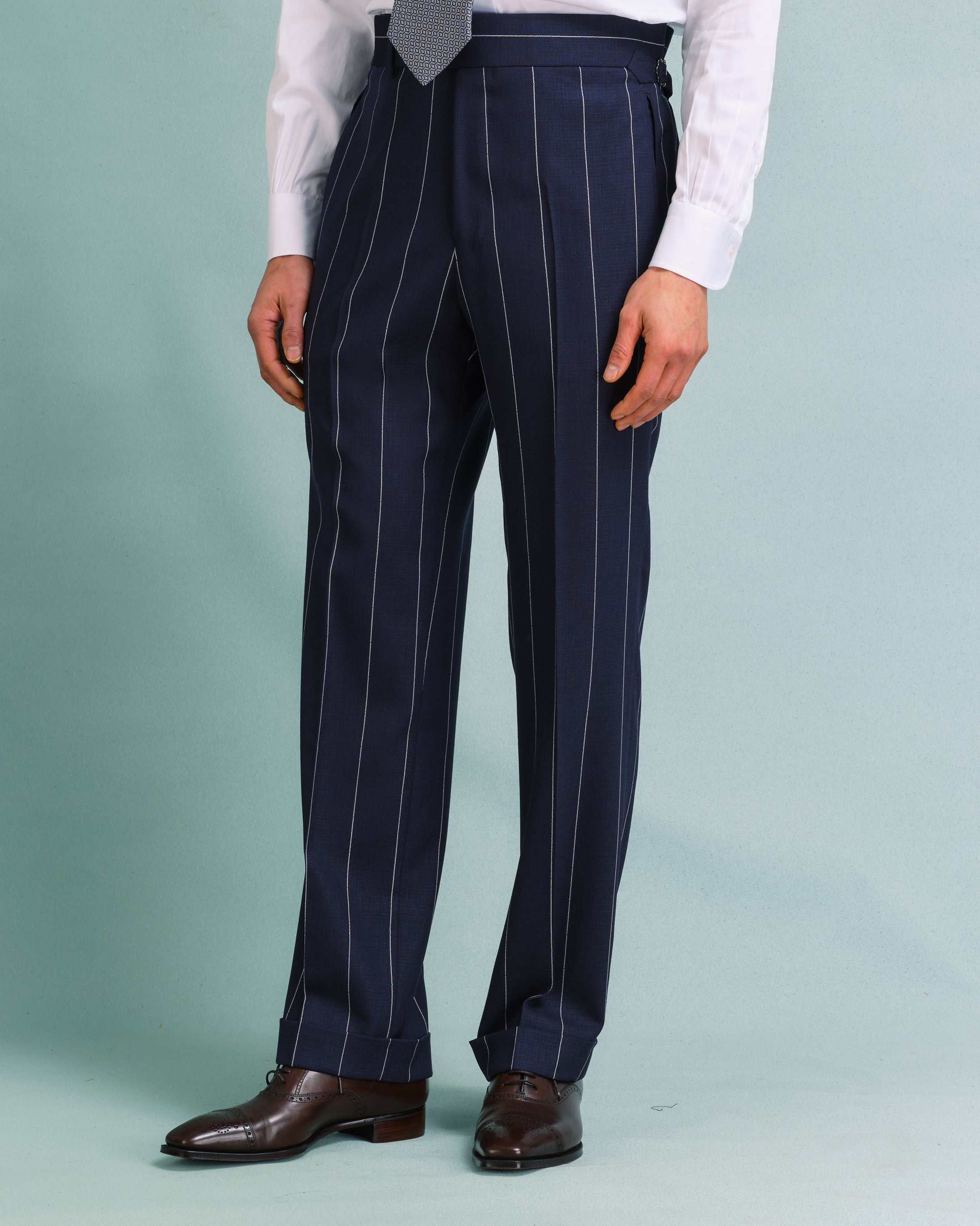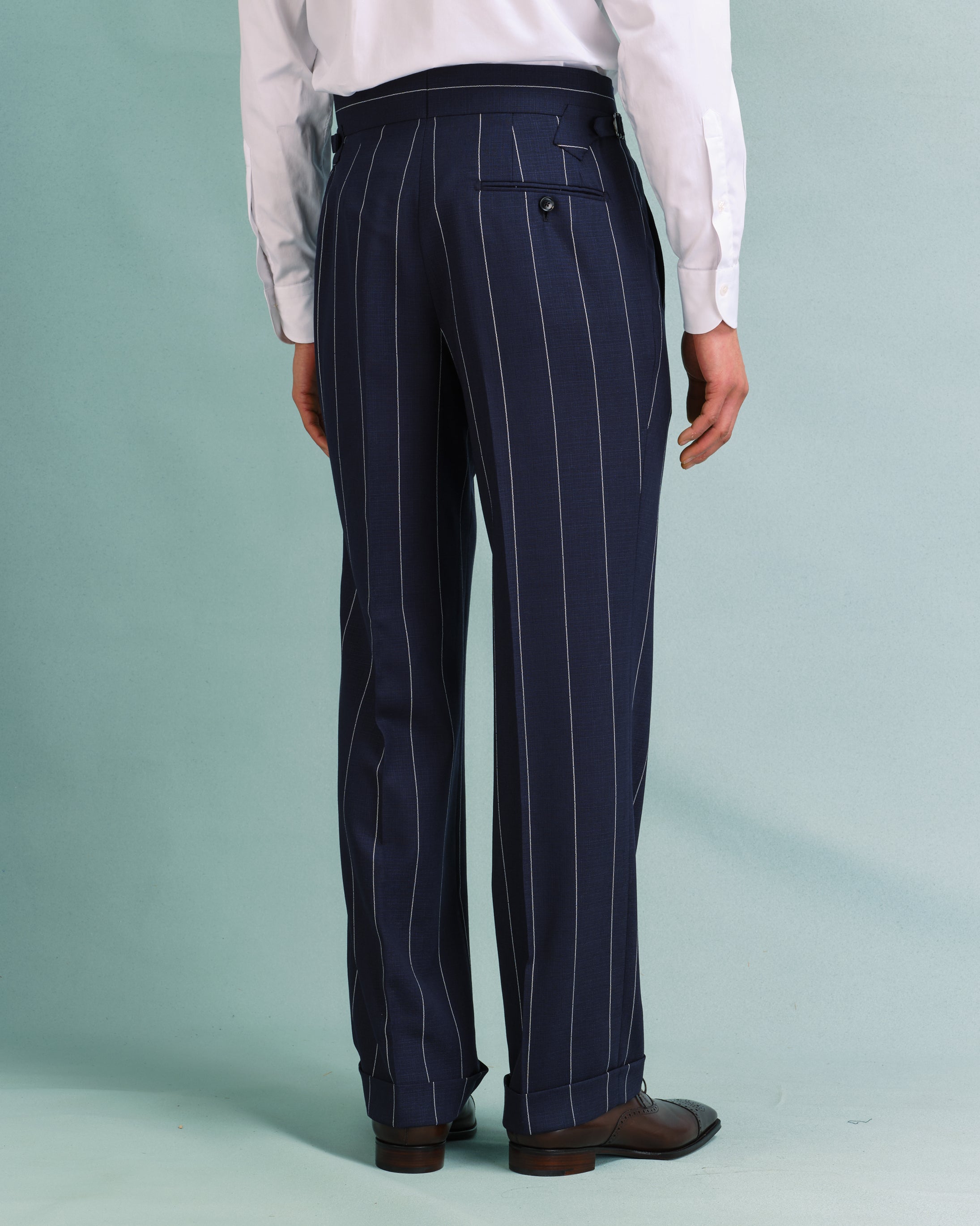 Our classic gentlemen's trouser developed in 2023 is clean and close around the top but fuller through the knee and hem. This trouser is both comfortable and timelessly elegant, and with its 2" waistband with a long extension and side adjusters, it sits beautifully on an elegant show or rests naturally on a trainer.