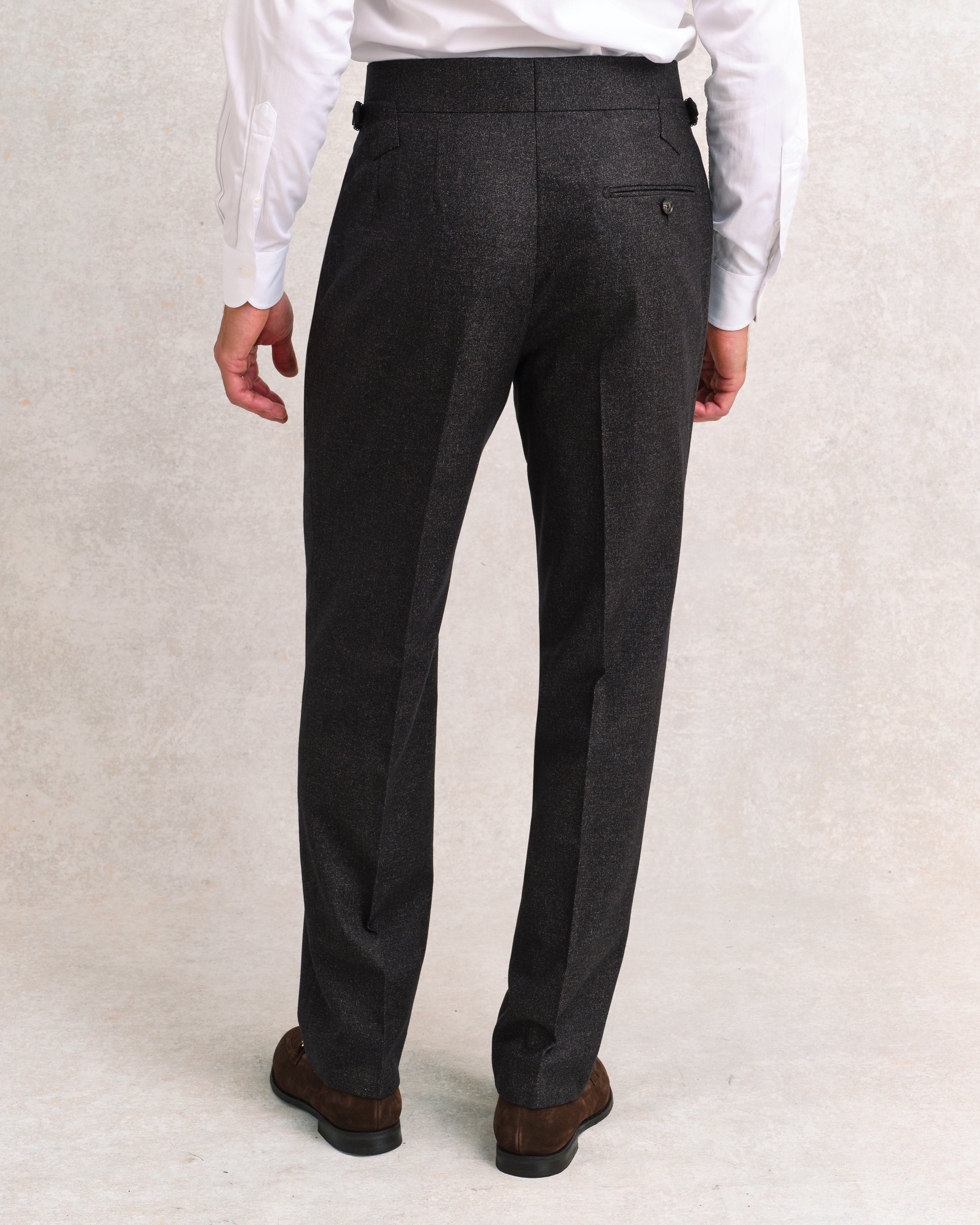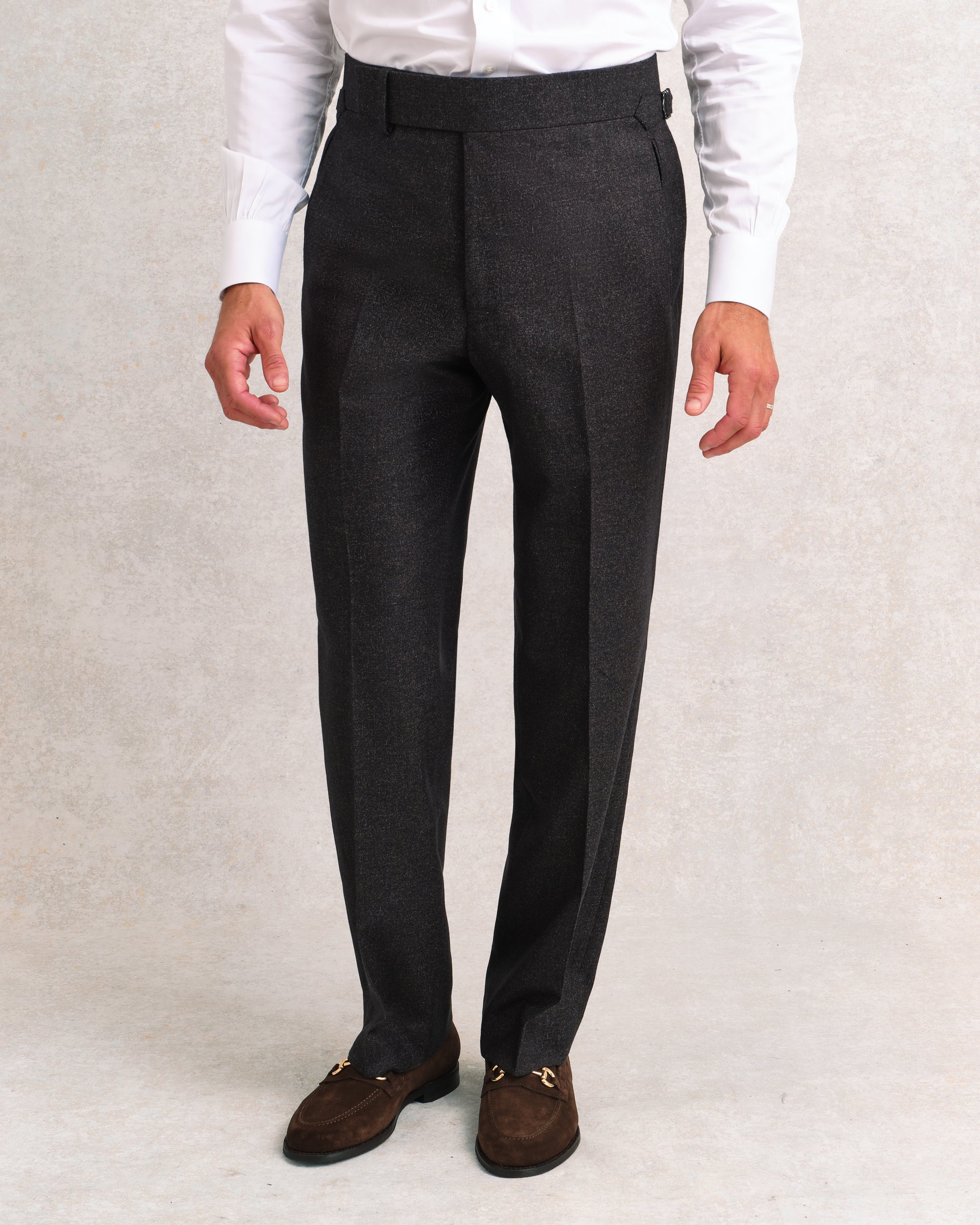In rich chocolate melange wool flannel, these trousers offer timeless elegance in a clean, contemporary silhouette. The flat-front design and standard waist create a sleek, versatile line that pairs effortlessly with the coordinating notch lapel jacket or can be styled solo for smart-casual refinement. Incredibly comfortable to wear and soft against the skin.