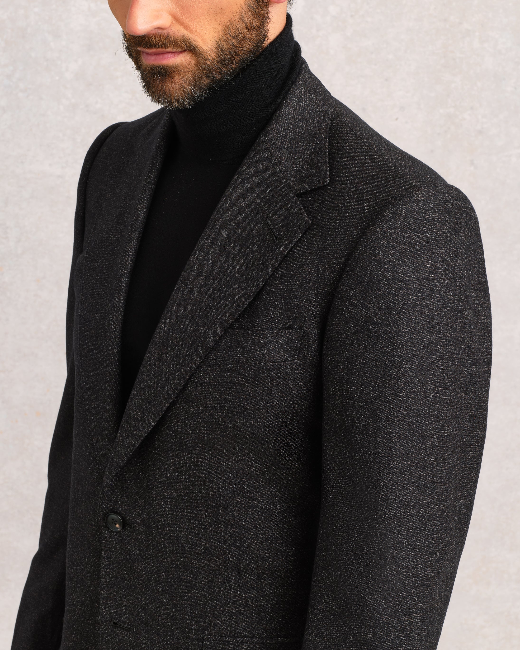 Sleek, modern, and effortlessly versatile, this bitter chocolate melange jacket elevates contemporary tailoring with rich, textured depth. The subtle melange weave adds visual interest, while the tailored cut and classic notch lapel create a polished, confident silhouette. Perfect for smart-casual settings, evening events, or layering over crisp shirting for refined everyday style.
