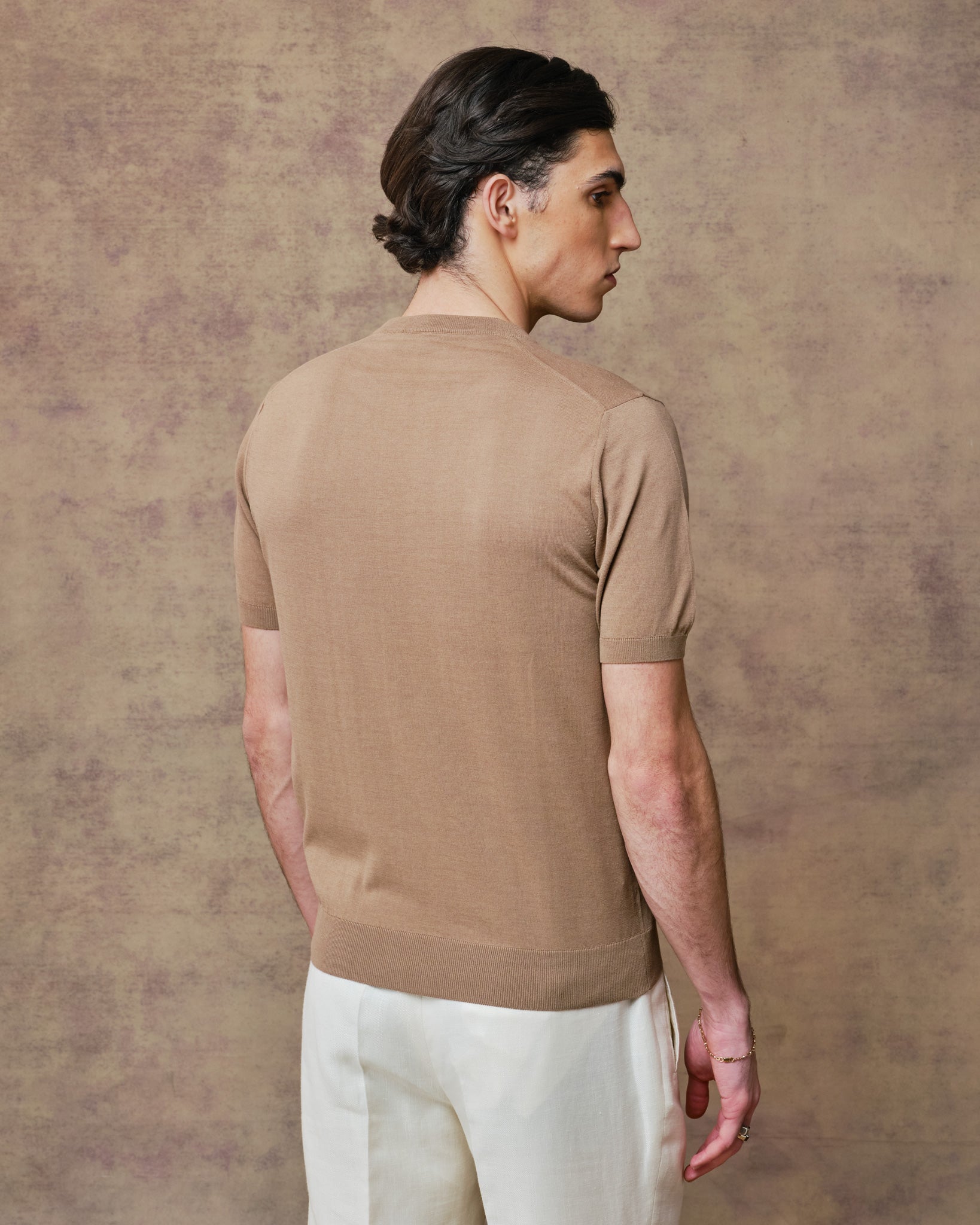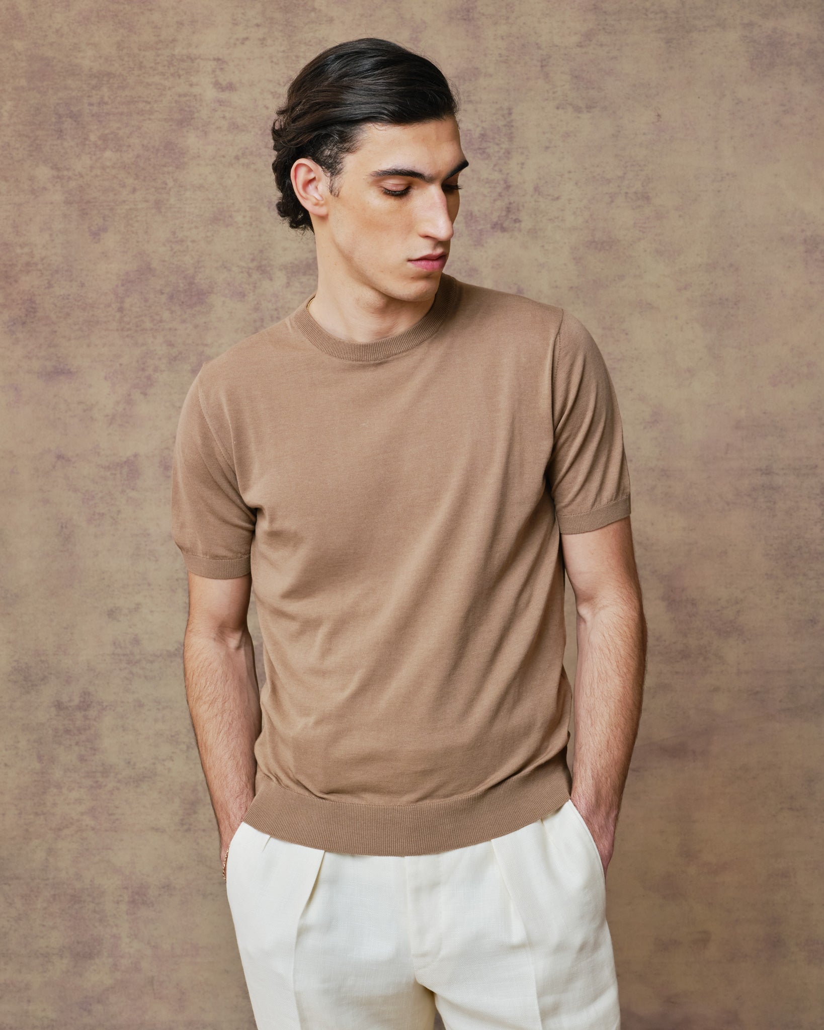 Sleek and elegant lightweight knitted t-shirt in 70% Cotton, 30% Silk, perfect to wear under your summer jacket or alone with a pair of our Hollywood or Classic Trousers.