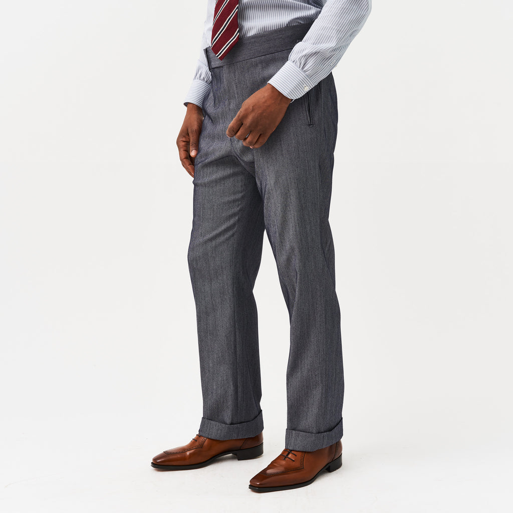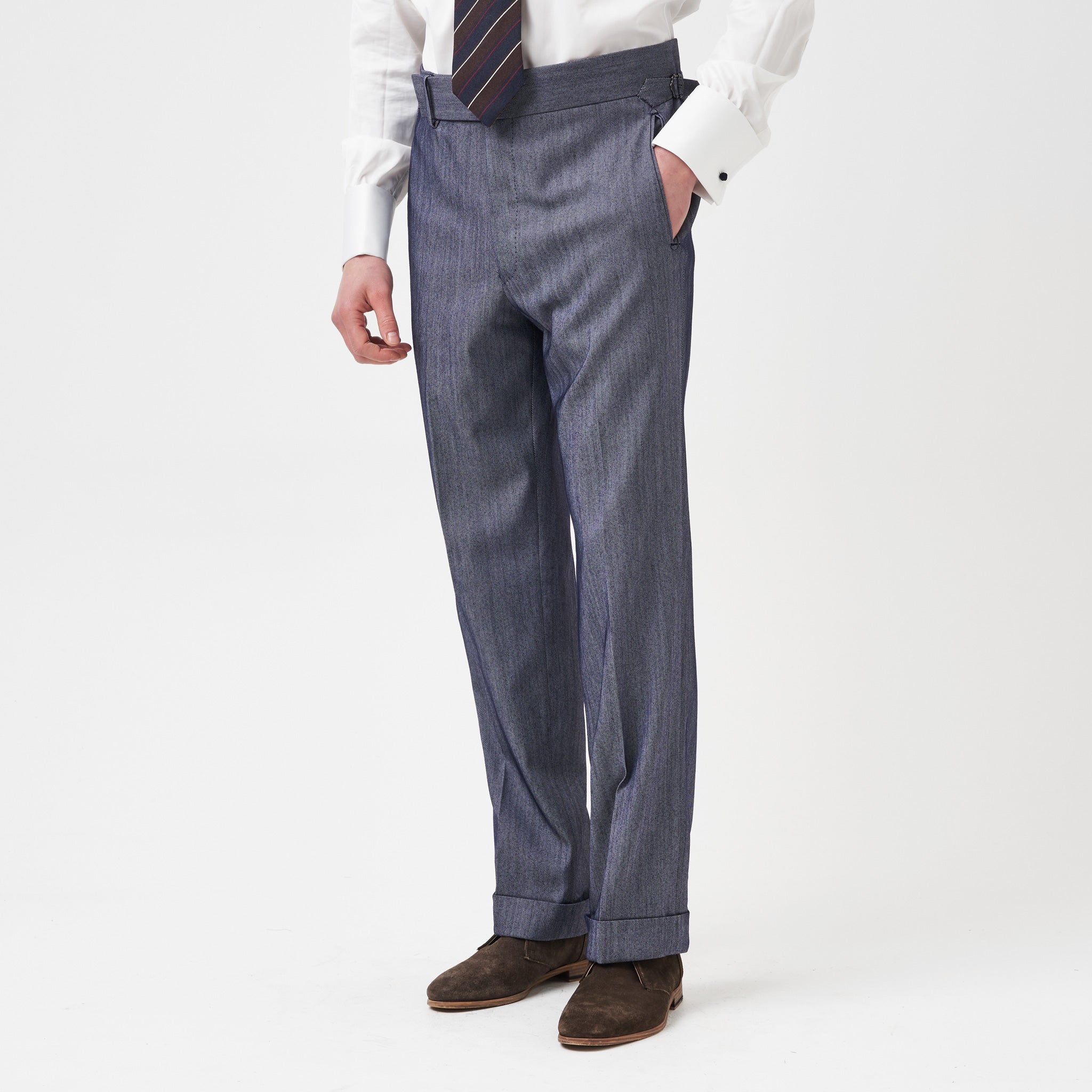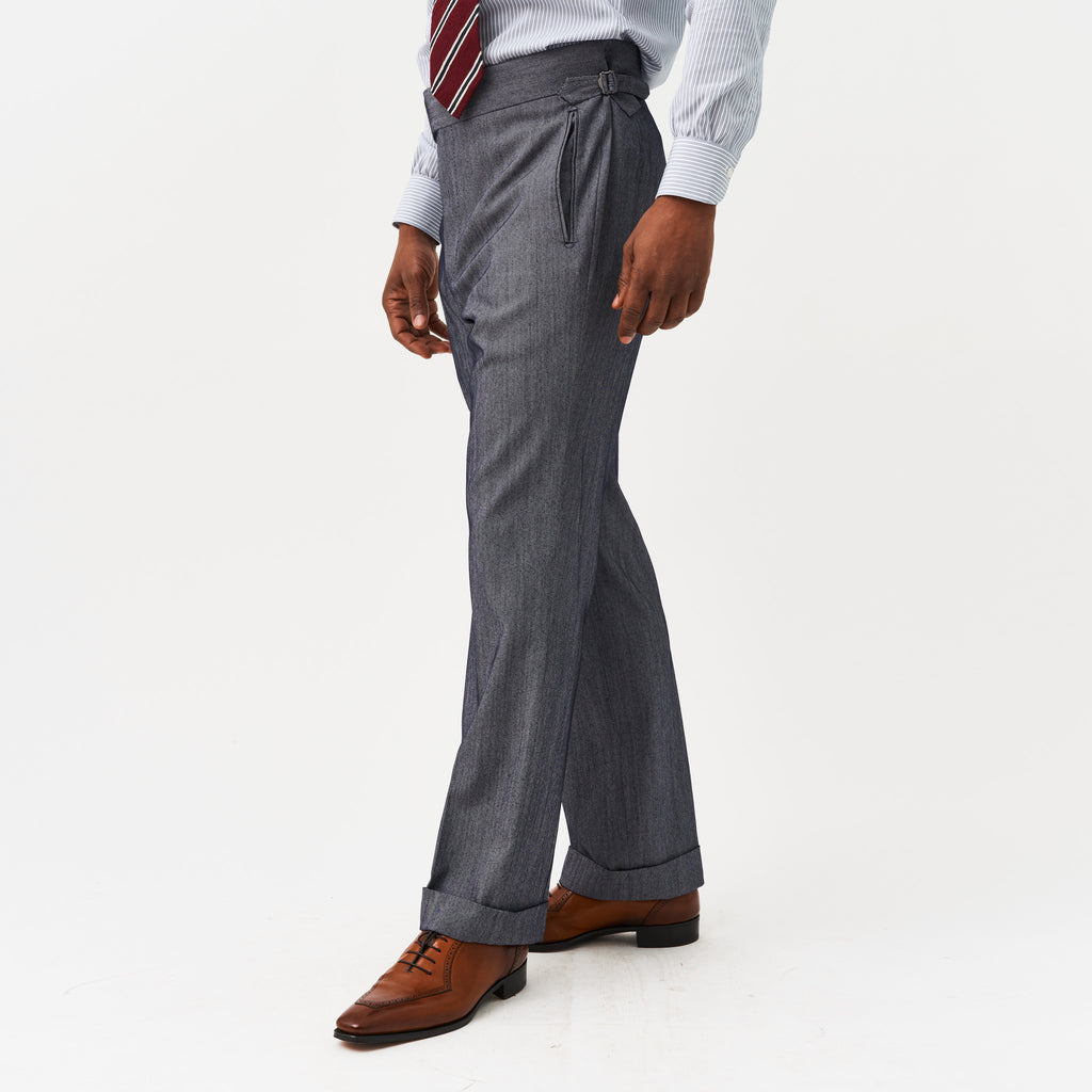Our tailored denim trousers work just as well as a separate as a suit the grey blue denim has a cool fresh finish.