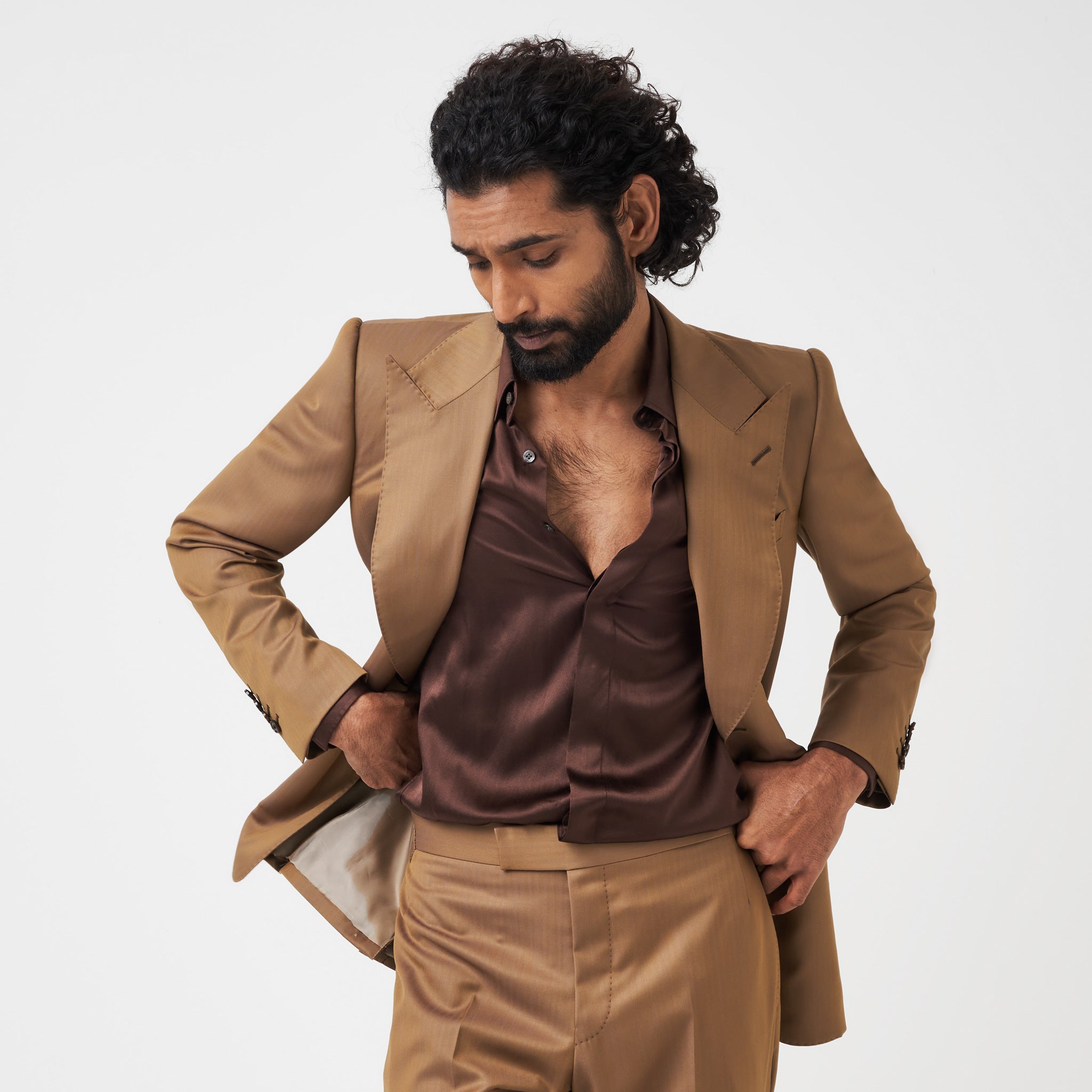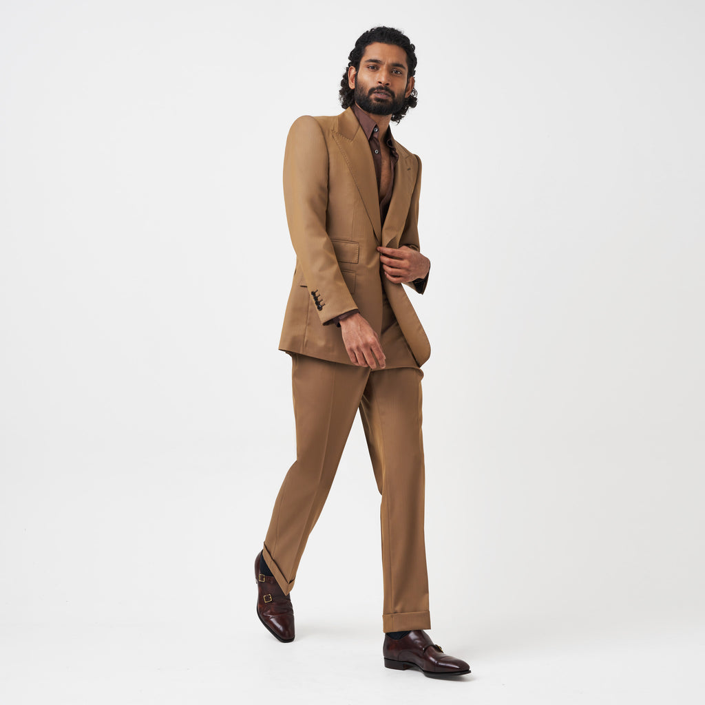 Ultra fine merino wool, woven in two tone brown and gold, like a solaro to create a surface that reflects a lot of light meaning the shade varies in different lights. 100% wool; woven in Italy