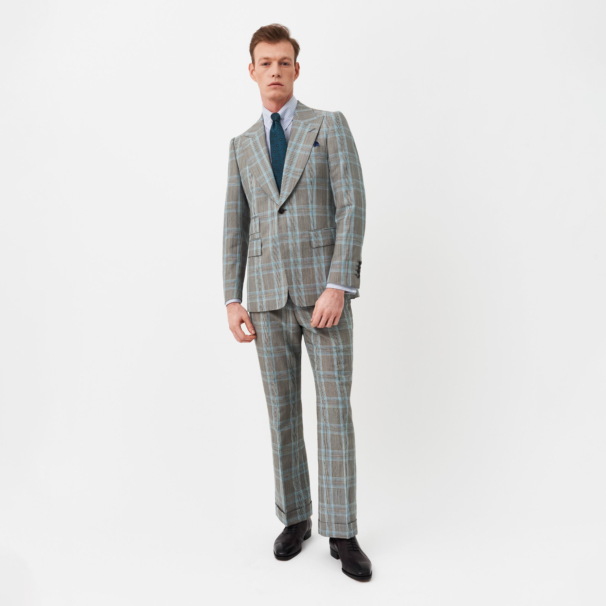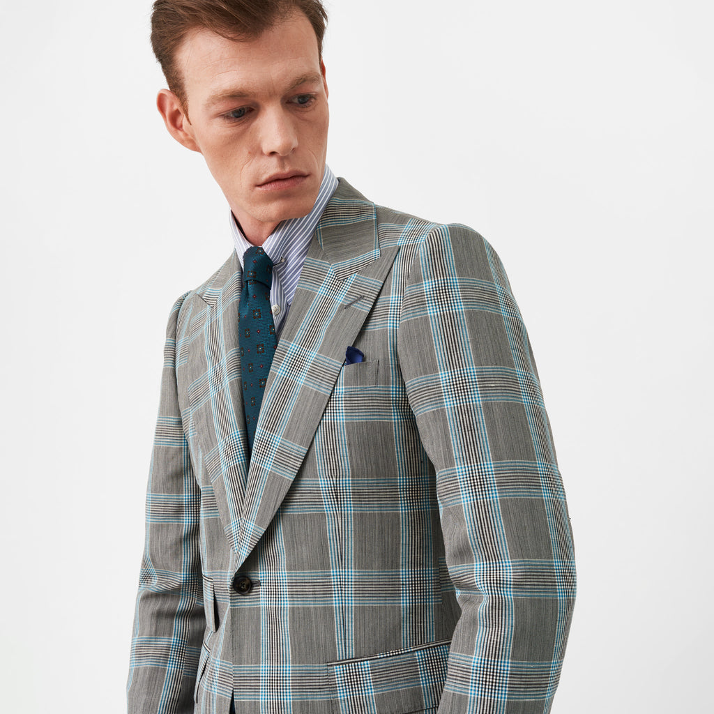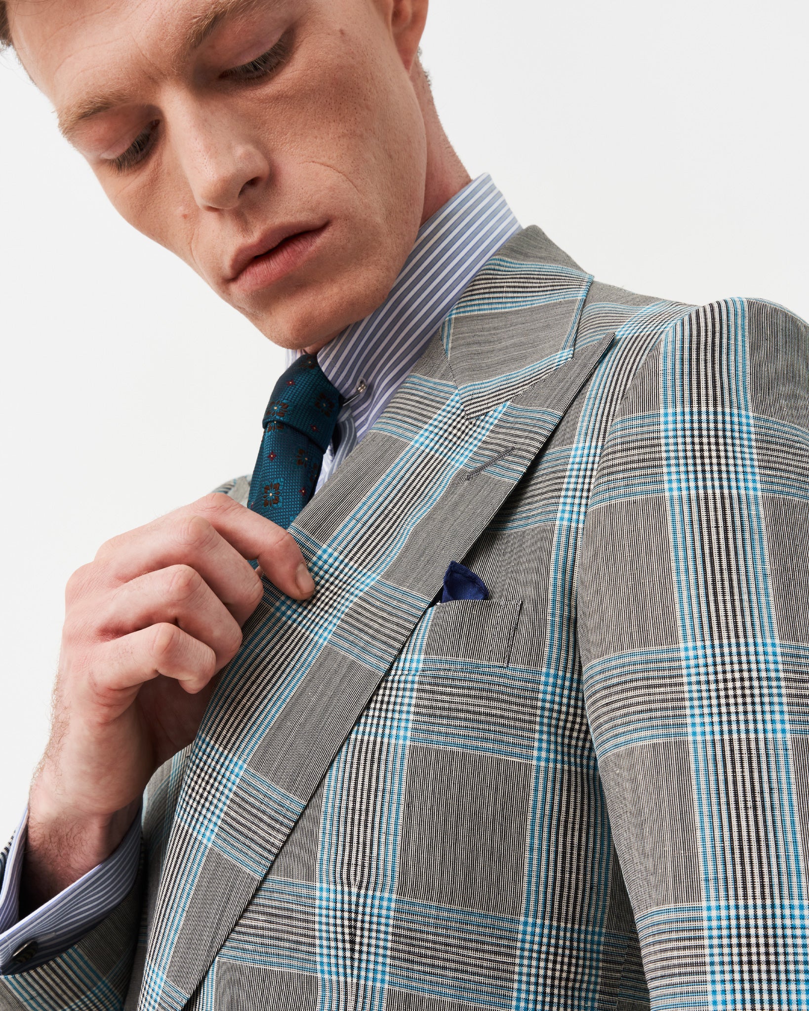 Taking inspiration from our heritage, a modern nostalgic take on a Sexton classic. A simple glen check spiced up with a bold teal over check, not for the faint hearted. Wear it as a suit with our parallel trousers or equally it can work as a sports jacket.