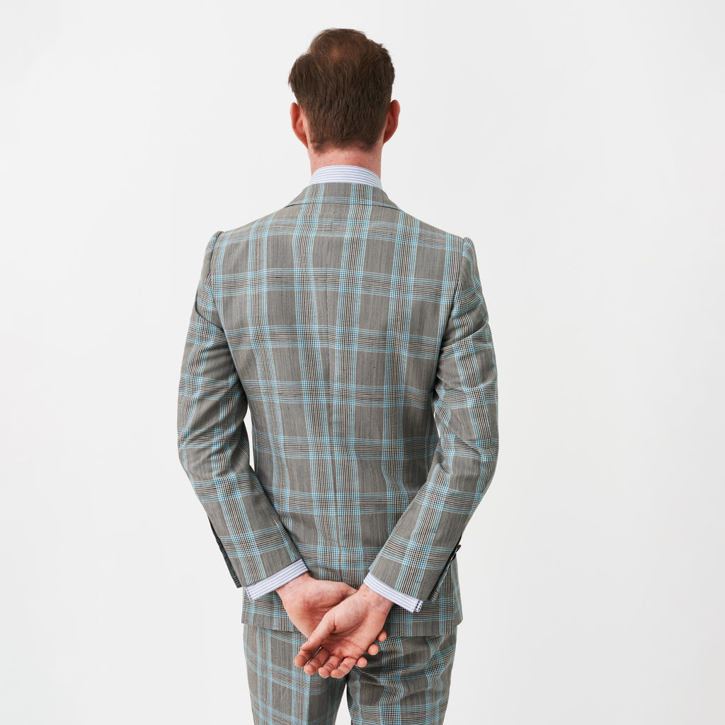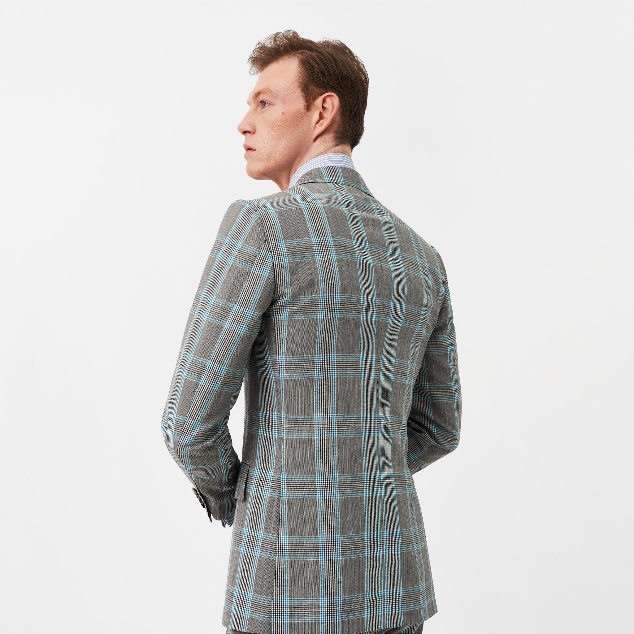 Bold Grey and Teal Glen check in Italian mid weight 55% Wool 45% Linen, the beautiful slubby character of the linen can be seen in the weave. The large percentage of wool gives the fabric performance to not look crumpled, but the linen does allow the movements of the day to show a little.
