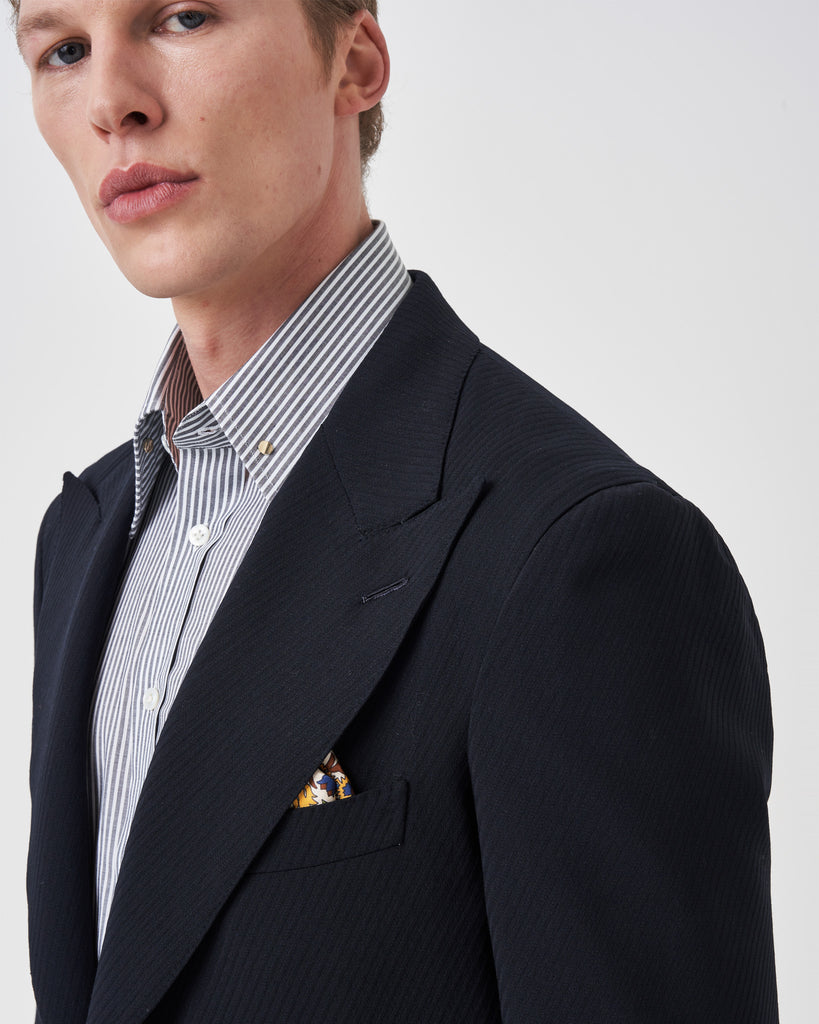 The pin collar is an Edward Sexton signature, designed to be worn with a tie and one of our solid gold or sterling silver collar pins. The pin sits beneath your tie knot and keeps the tie standing proud from the neck, filled with life and shape. Pair with a double-breasted suit and contrast collar shirt for maximum impact.