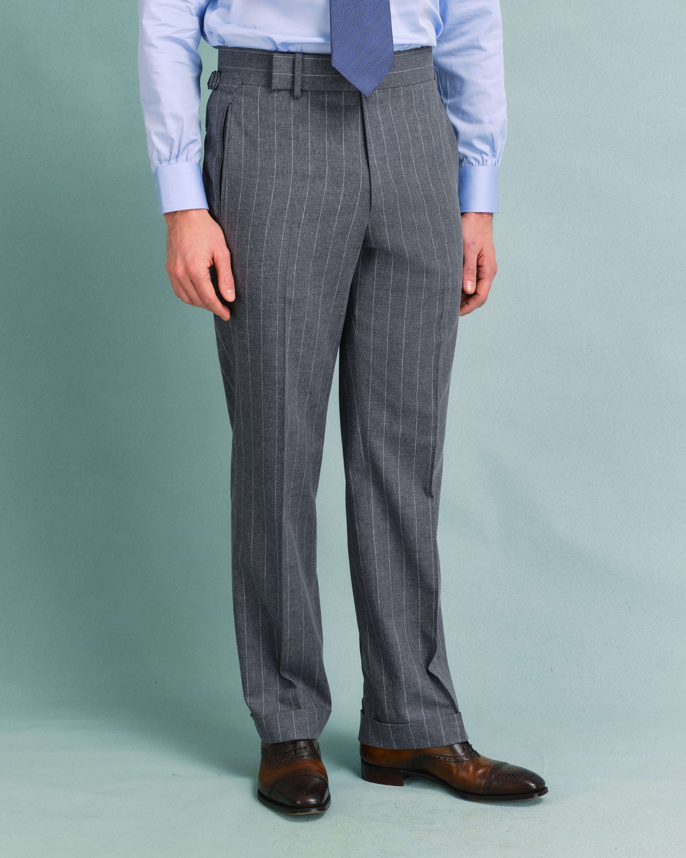 Our classic gentlemen's trouser developed in 2023 is clean and close around the top but fuller through the knee and hem. This trouser is both comfortable and timelessly elegant, and with its 2" waistband with a long extension and side adjusters, it sits beautifully on an elegant show or rests naturally on a trainer.