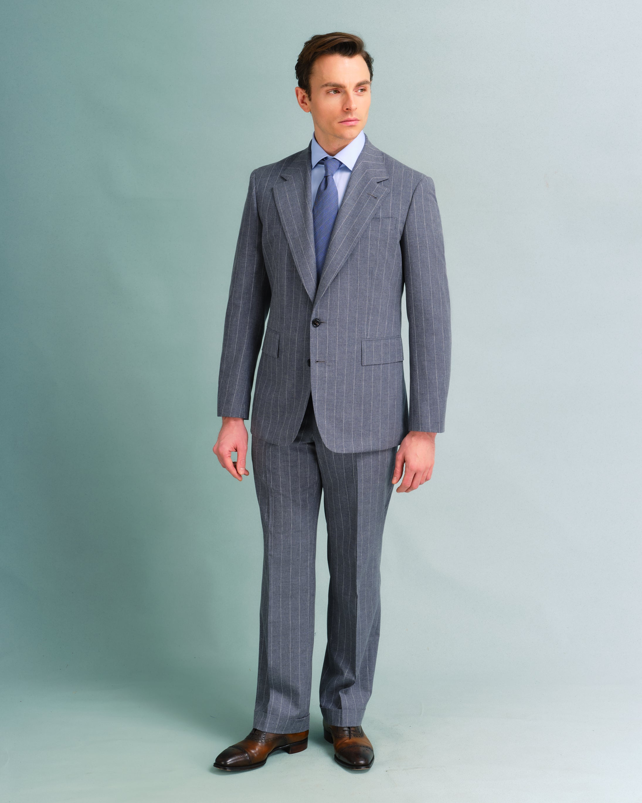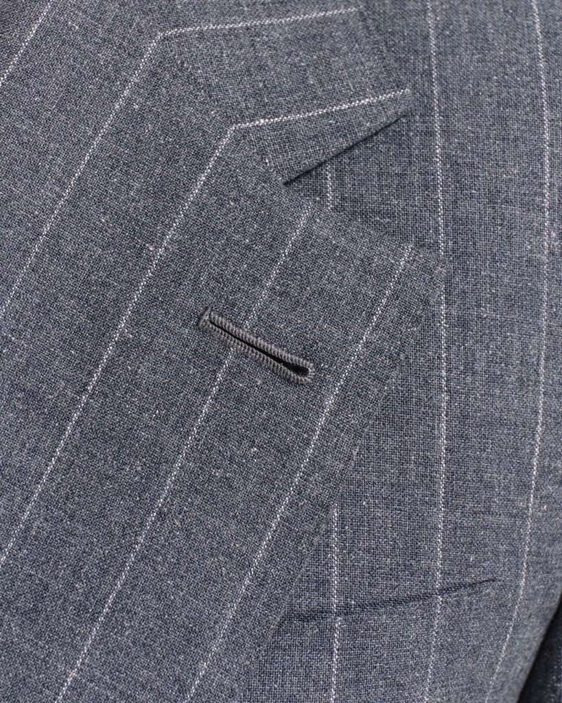 Woven in Italy, weighing a cool 275g, this cloth is a blend of 55% wool, 35% Cotton and 10% Silk. While light weight, the cloth remains drapey and resists creases. The colour is a mid-grey with mottled flecks, with a soft off-white pinstripe repeating every 1".
