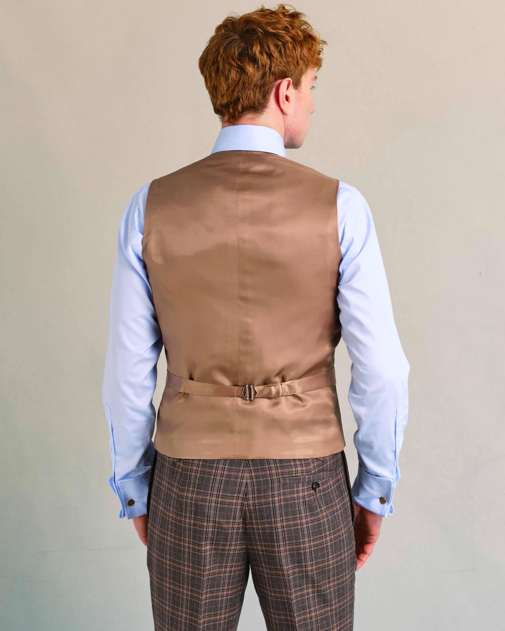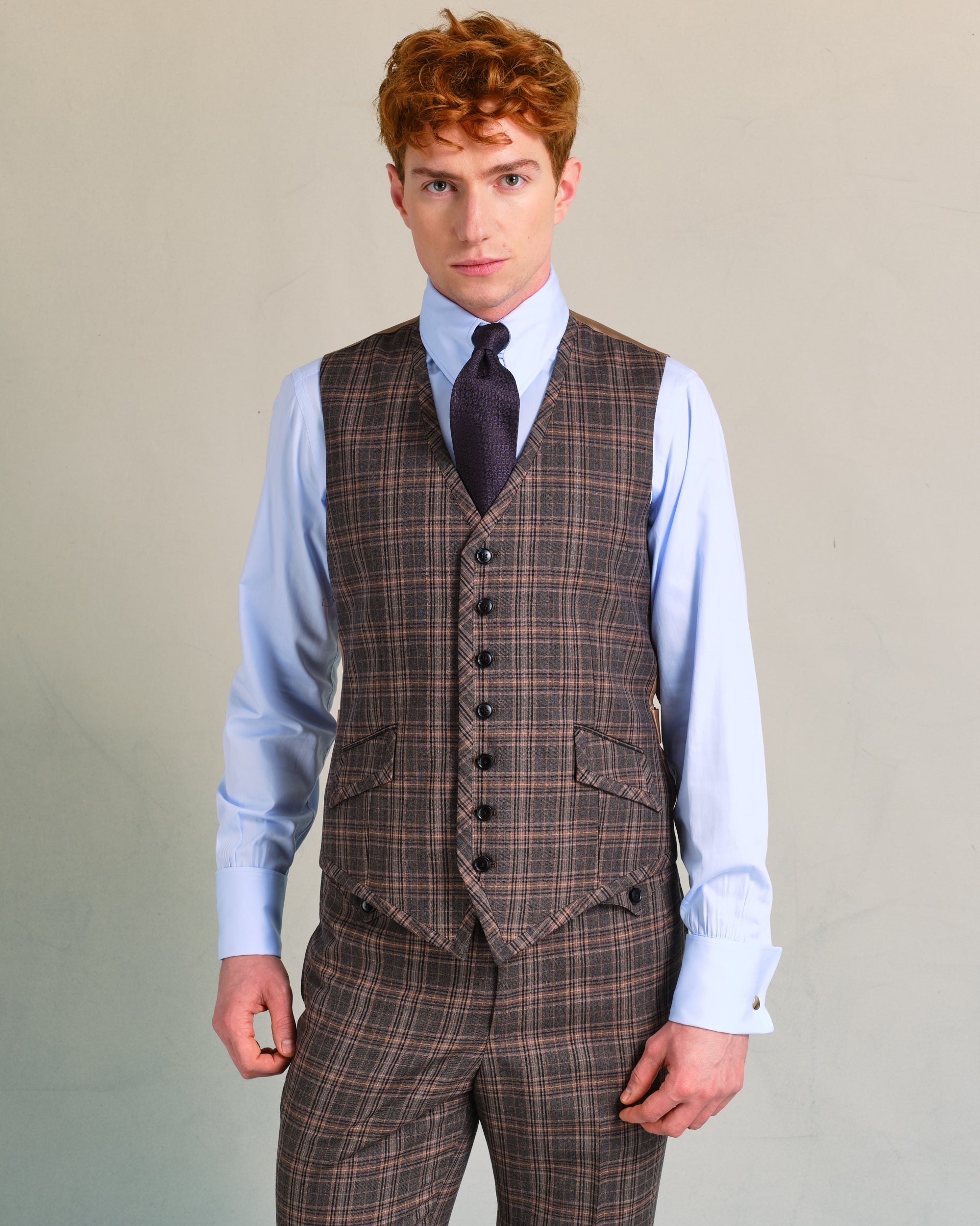 Channel the spirit of the 70's with this Italian-made 290g, 100% wool fabric. The brown check, composed of various shades of brown and earth tones, this is very much inspired by our early suits from the late 60s and early 70s.