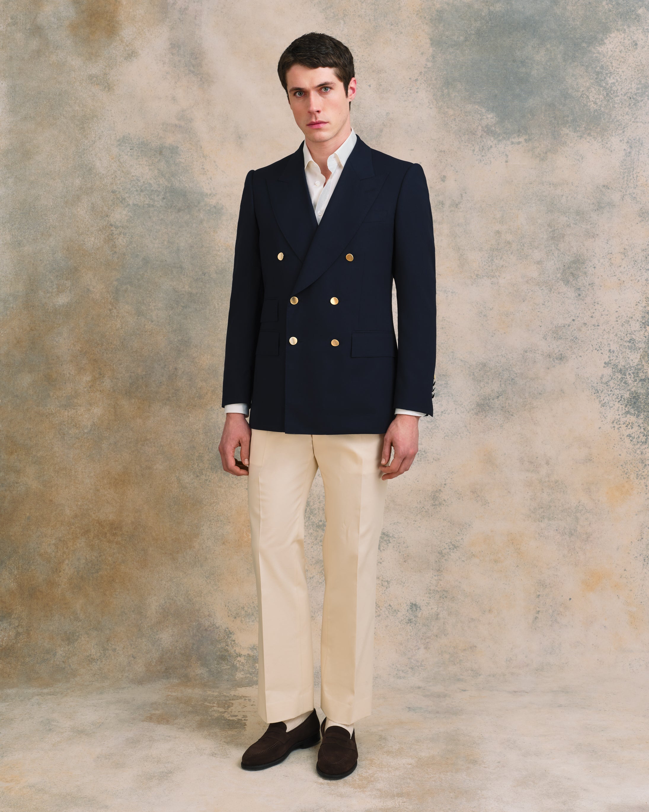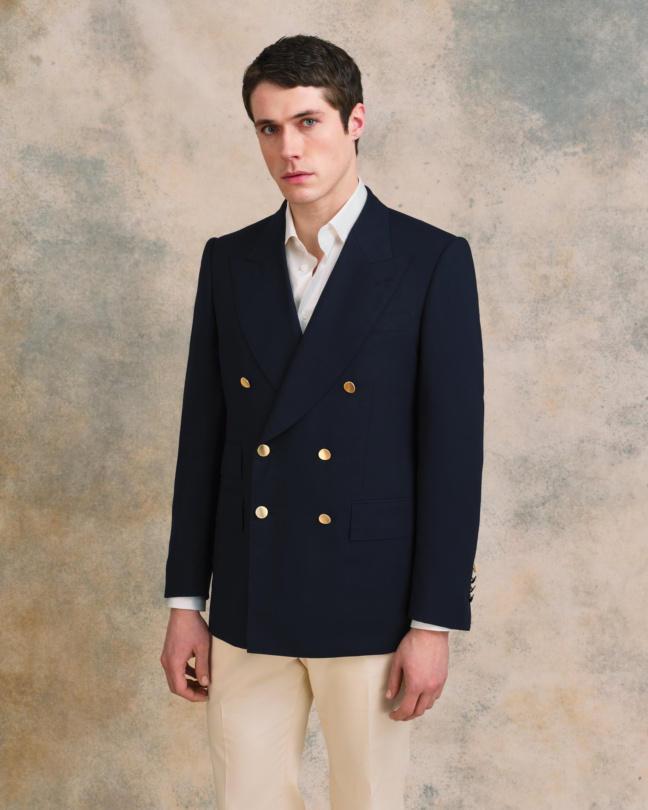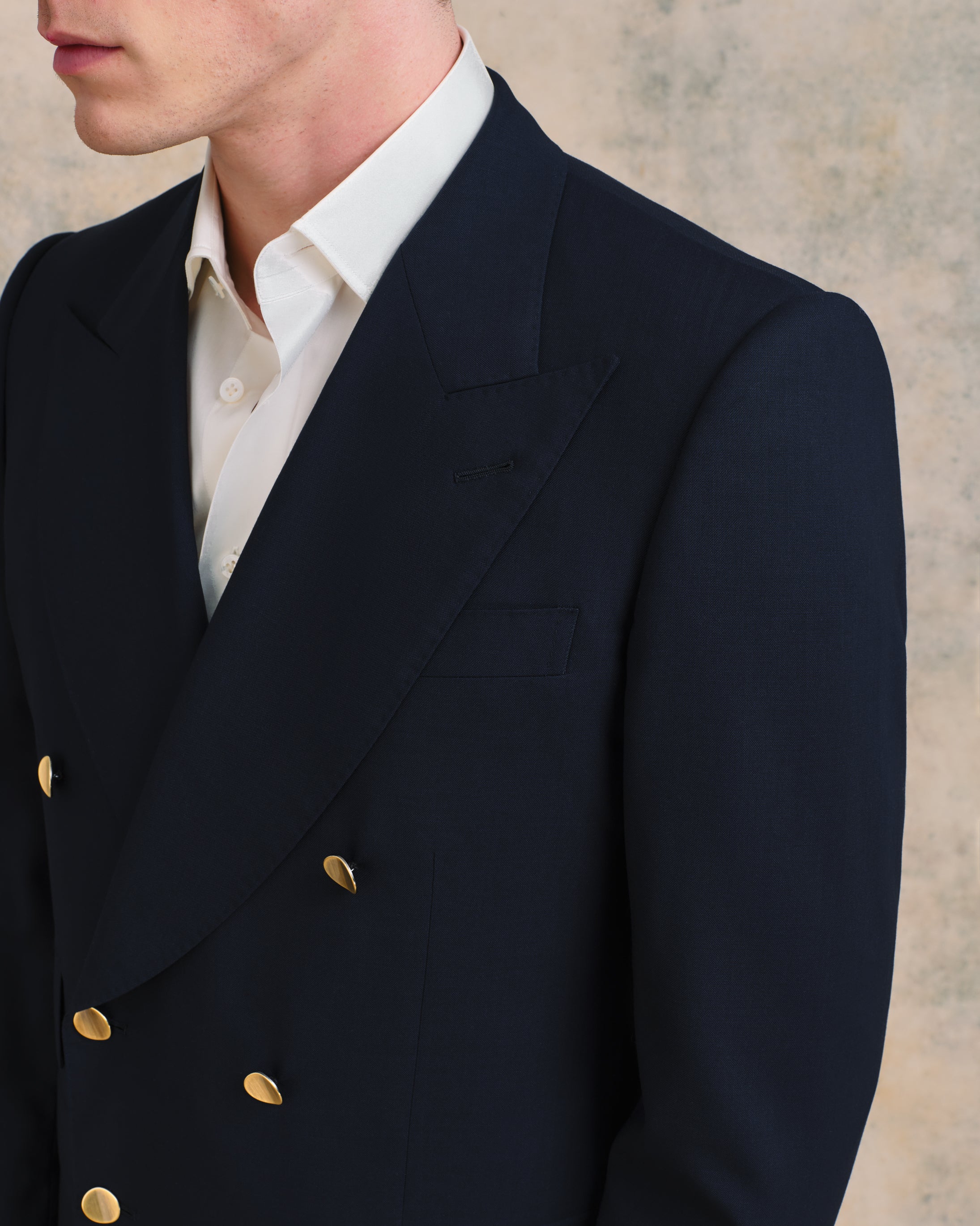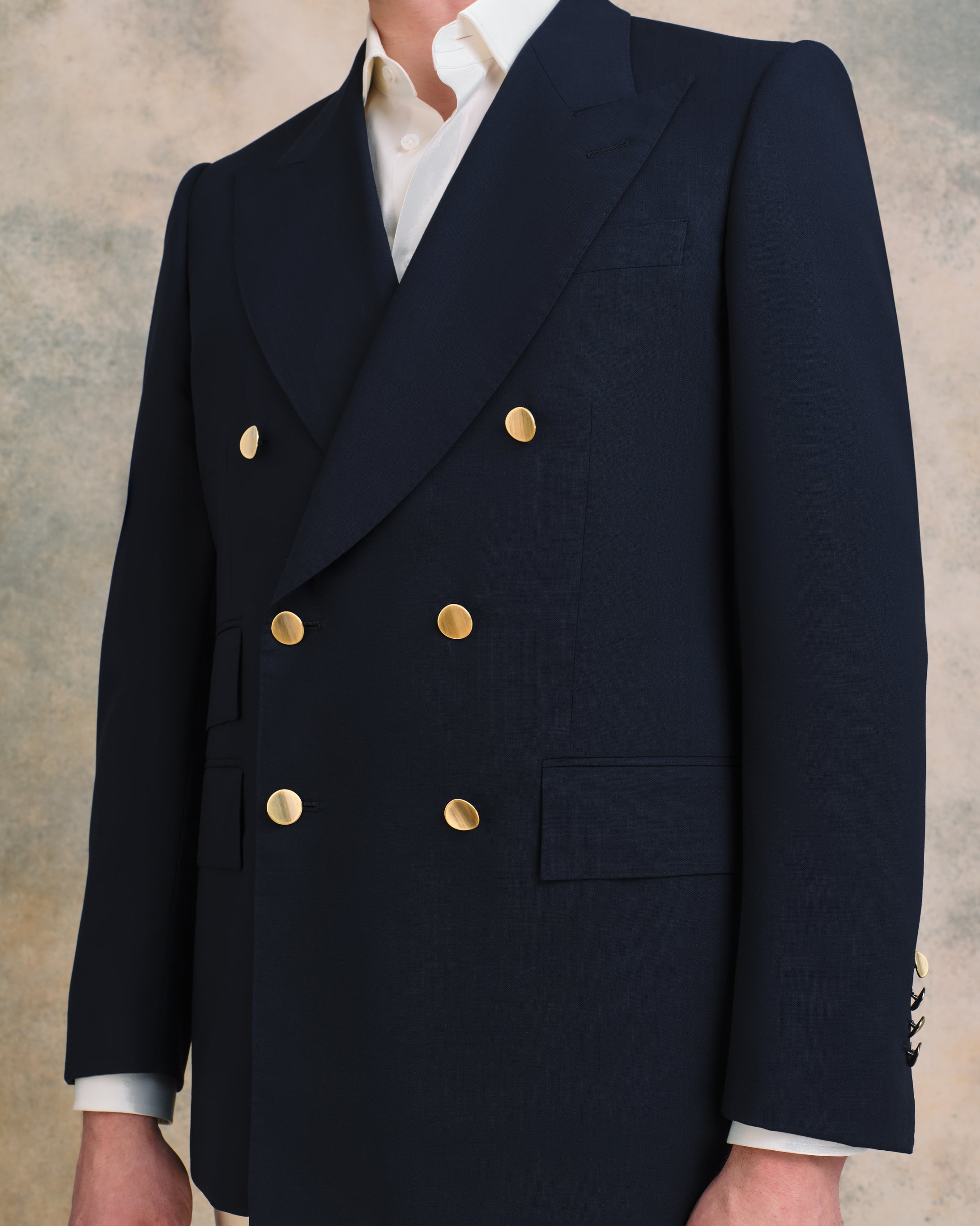 A Sexton summer staple, and one that will earn its place in the wardrobe for years. This double-breasted blazer is the classic Savile Row two-by-three in a breathable, high-twist open weave navy wool that travels well, resists creasing, and wears beautifully through the warmer months. The silhouette is traditional with a genuine Sexton touch - the signature concave brass buttons giving it just enough personality to lift it above the ordinary. Side vents and an out ticket pocket complete a thoroughly considered jacket.