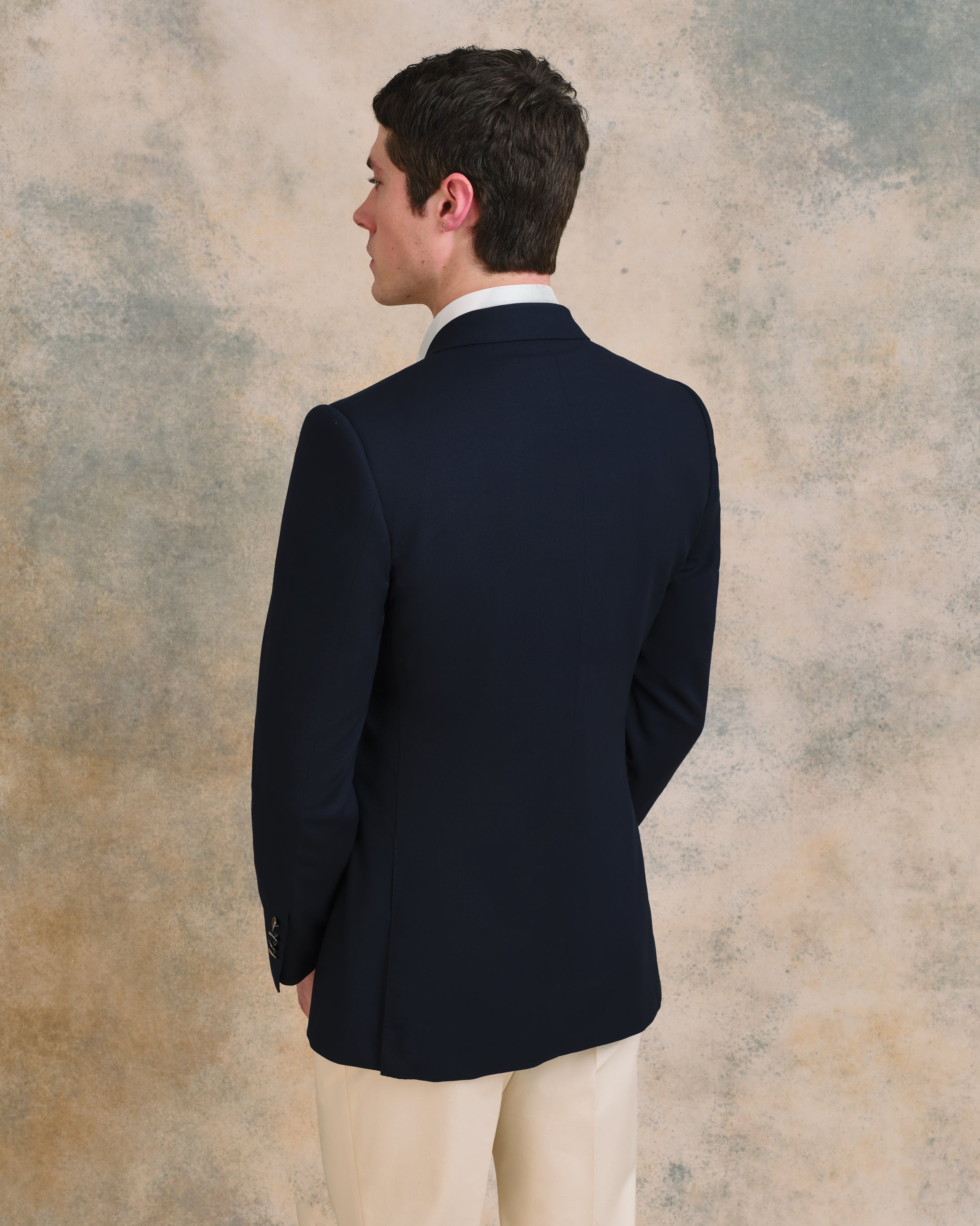 A classic deep navy in a high-twist open weave 100% wool - breathable, crease-resistant, and built to travel. The open weave construction keeps it cool through the warmer months without sacrificing the weight and composure that a good blazer demands. Woven in Italy. 100% Wool. 285g.