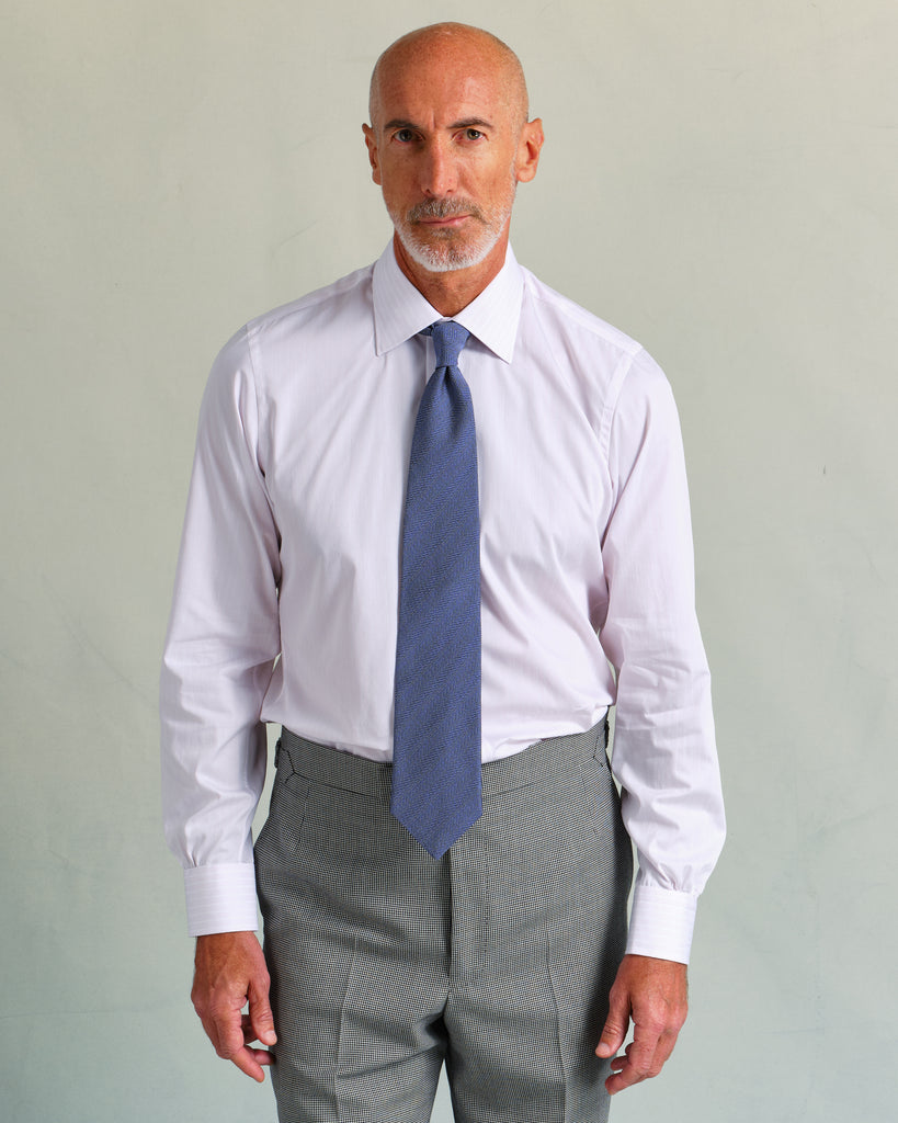 A generous well, proportioned classic gentleman shirt we an elegantly poised collar with a gentle hollow along the leaf edge. A perfectly balanced and proportioned shirt.