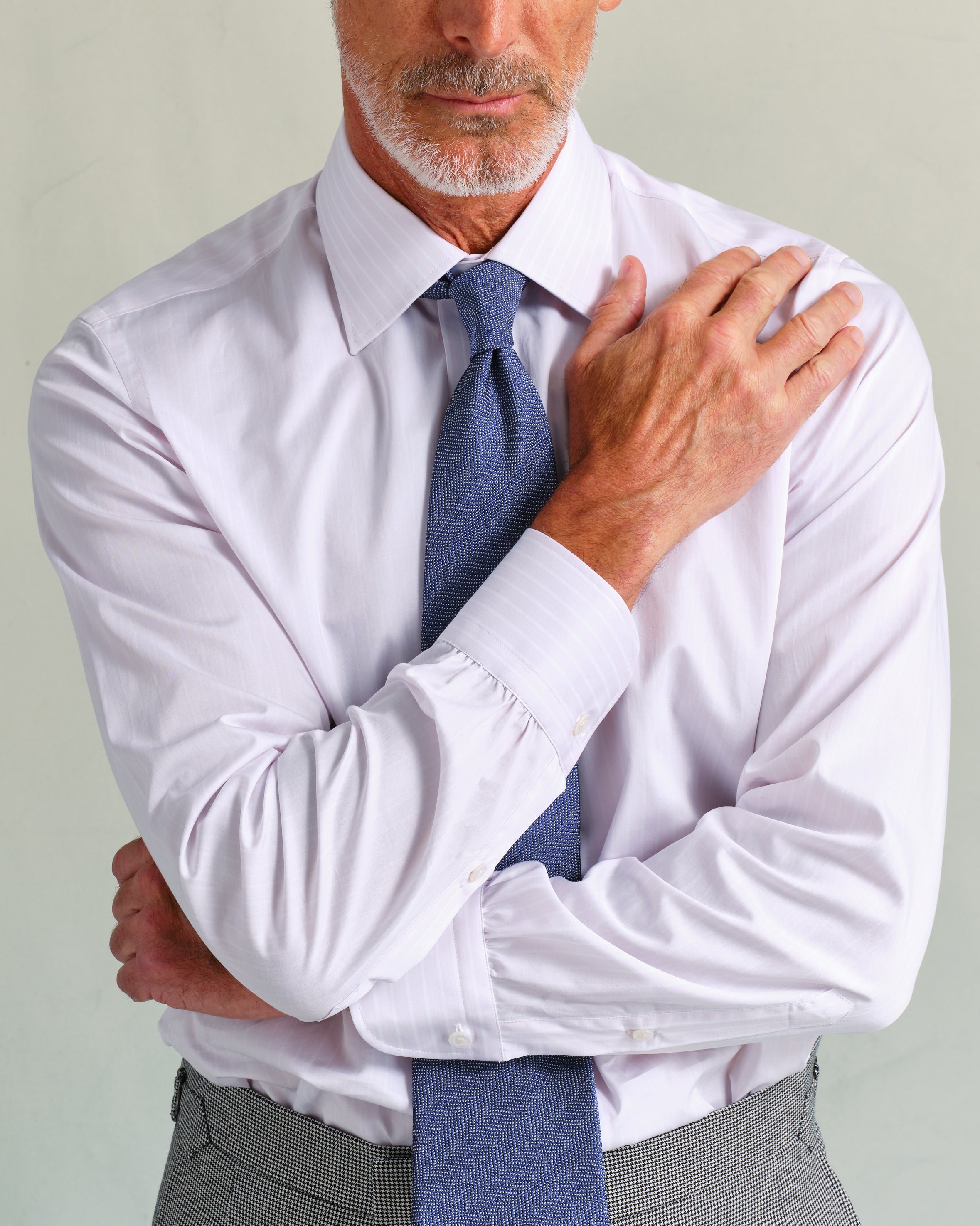 Very subtle pink with a contrasting narrow white stripes; this classic collar, button cuff shirt provides versatile styling for more formal suiting or separate looks, as well as making a great option for more casual trouser and shirt looks.