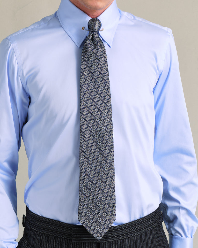 Featuring a unique, repeating pattern of diamond-like shapes; this silver tie is woven from 100% silk. The outlined shapes in Navy create an intricate design that adds a touch of fun whilst maintaining sophistication suitable for both formal and casual attire.